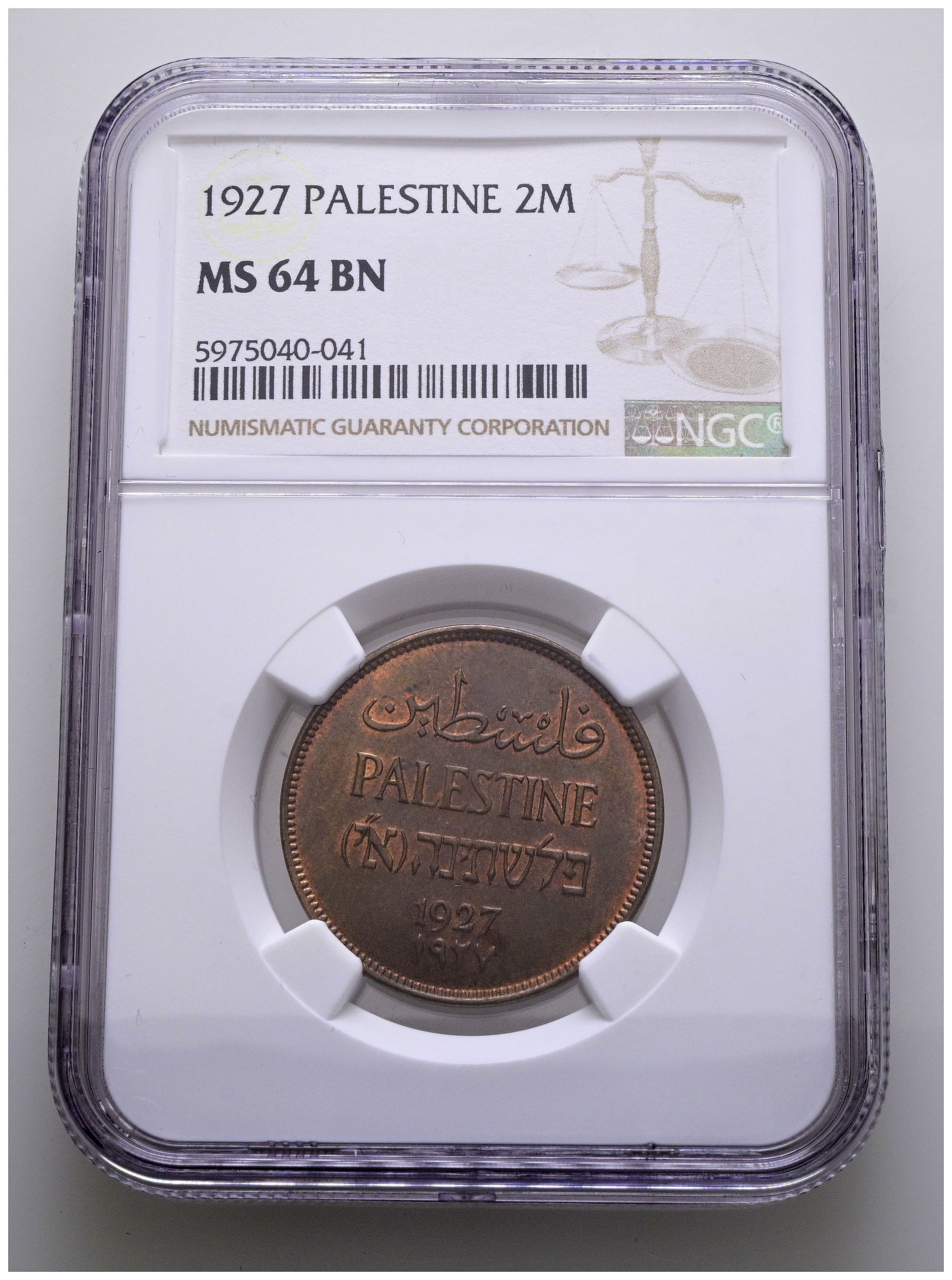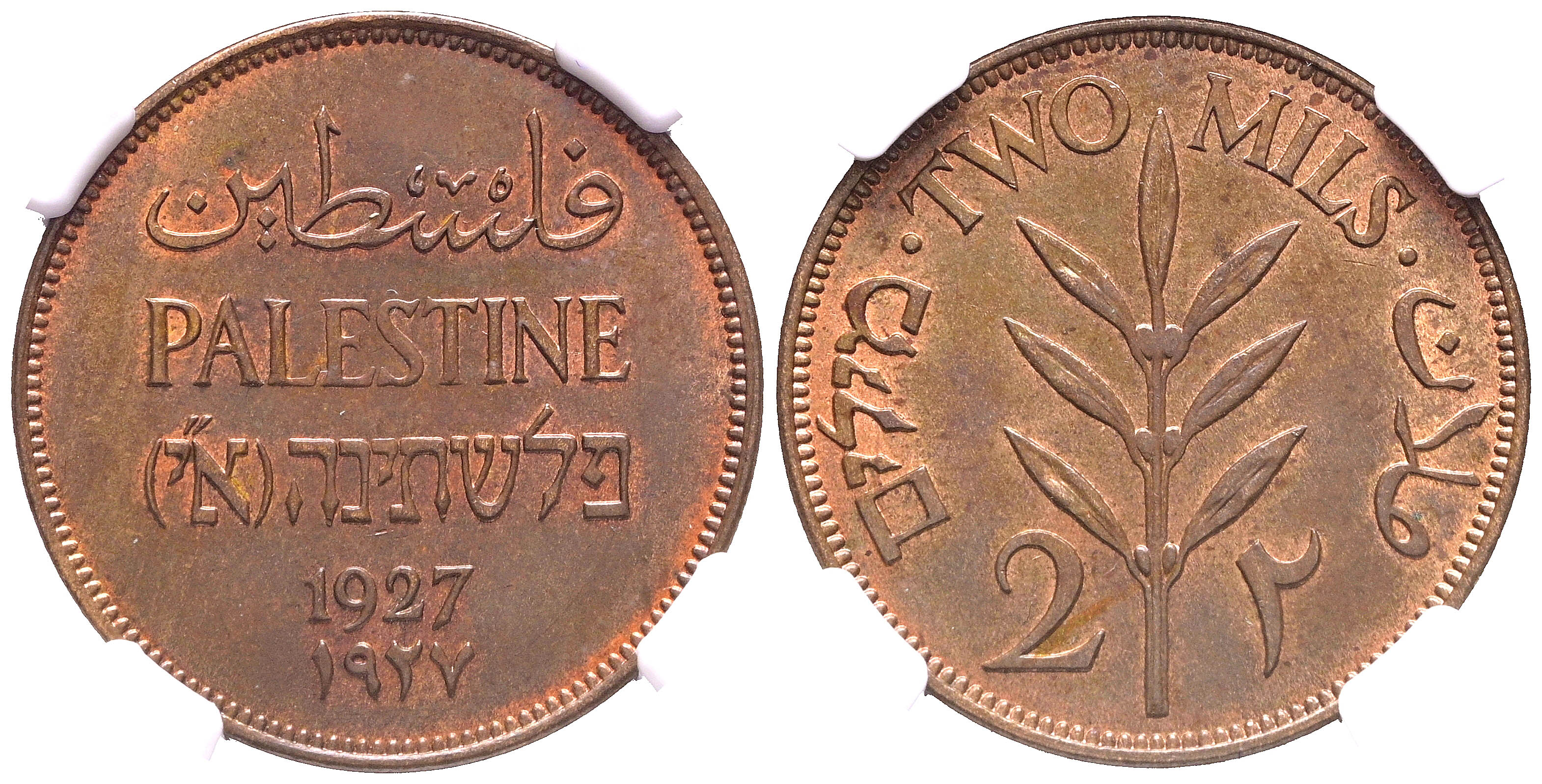 English PALESTINE, British Administration. 2 Mils. (Ae. 7.80g/28mm)*. 1927. (Km#2). Encapsulated by NGC MS 64 BN. *Theoretical weight and dimensions.