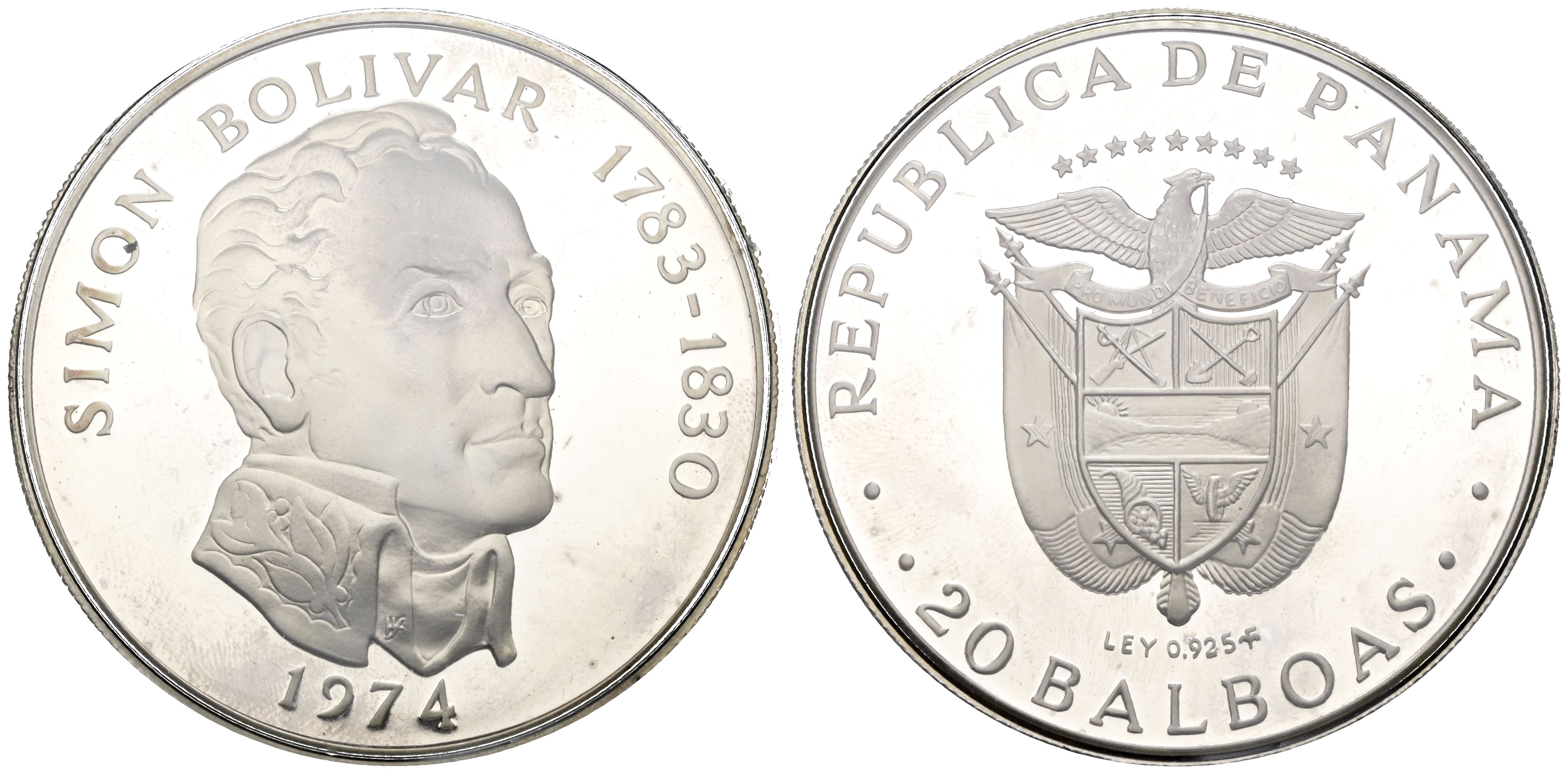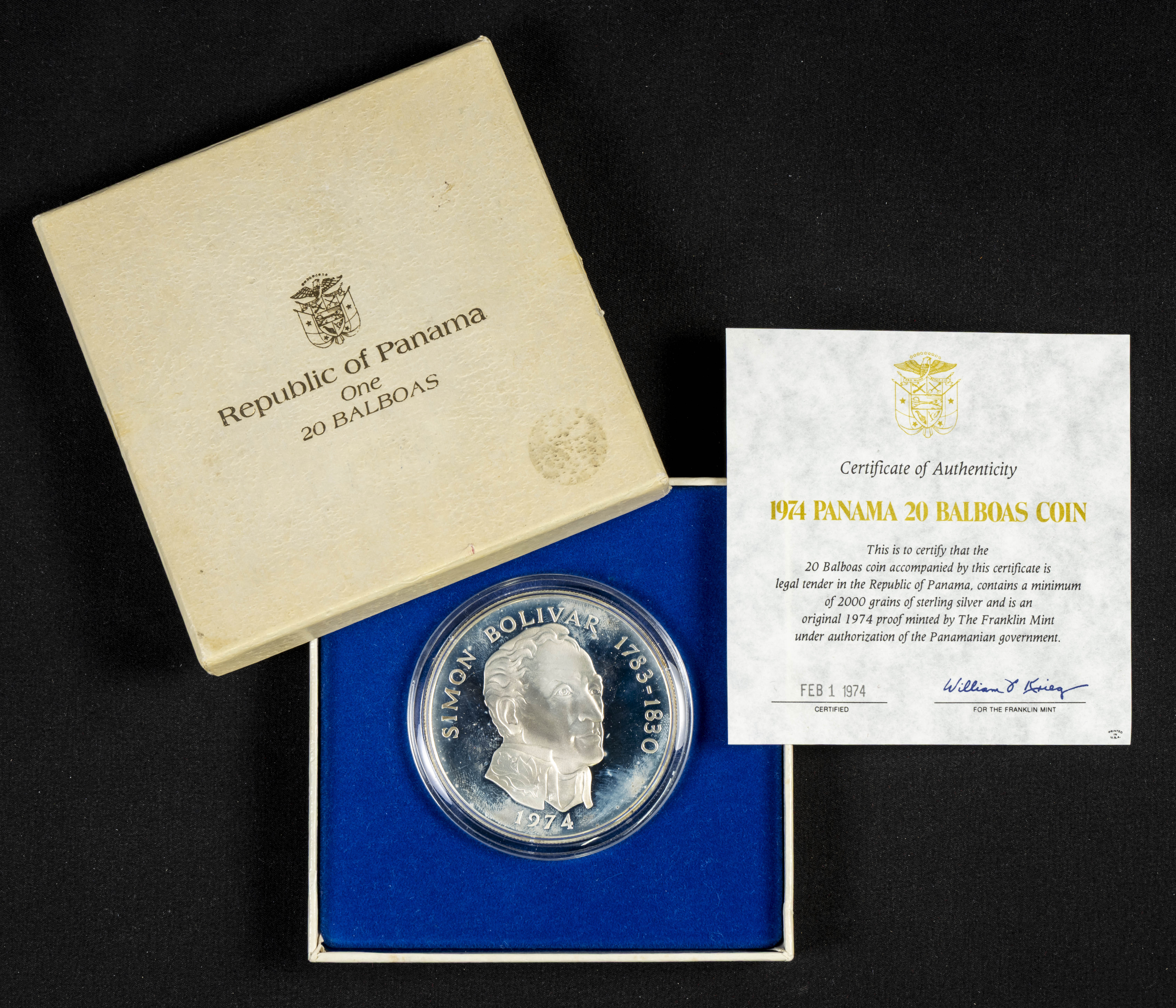 PANAMA. 20 Balboas (Ar. 129.91g / 60mm). 1974. Franklin Mint (Pennsylvania, USA). Simon Bolivar. (Km#31). PROOF. Includes original case and certificate of authenticity.