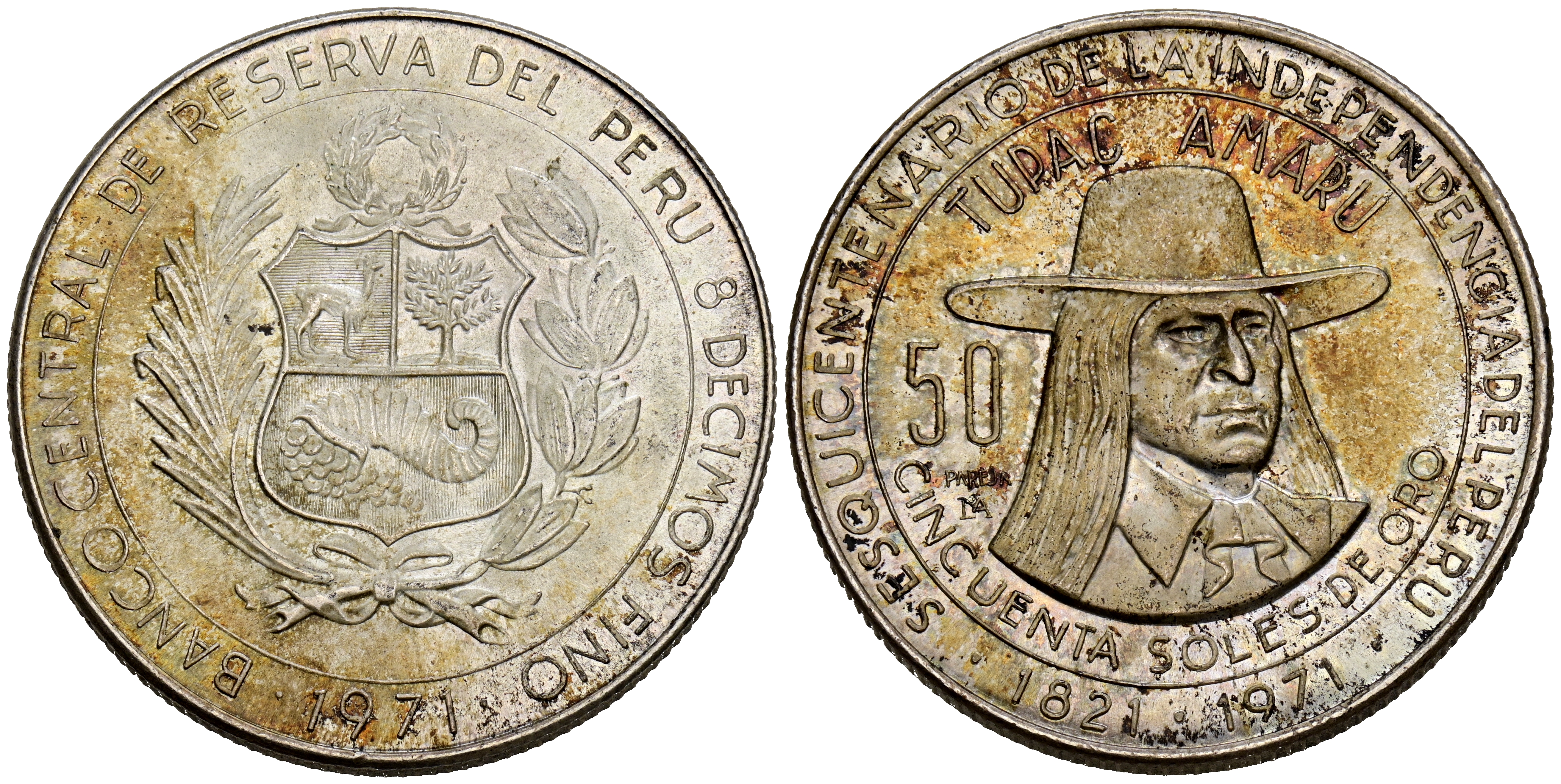 PERU. 50 Soles. (Ar. 21.44g/37mm). 1971. 150th Anniversary of Independence. (Km#256). EF/EF-. Oxidation, especially on the reverse.