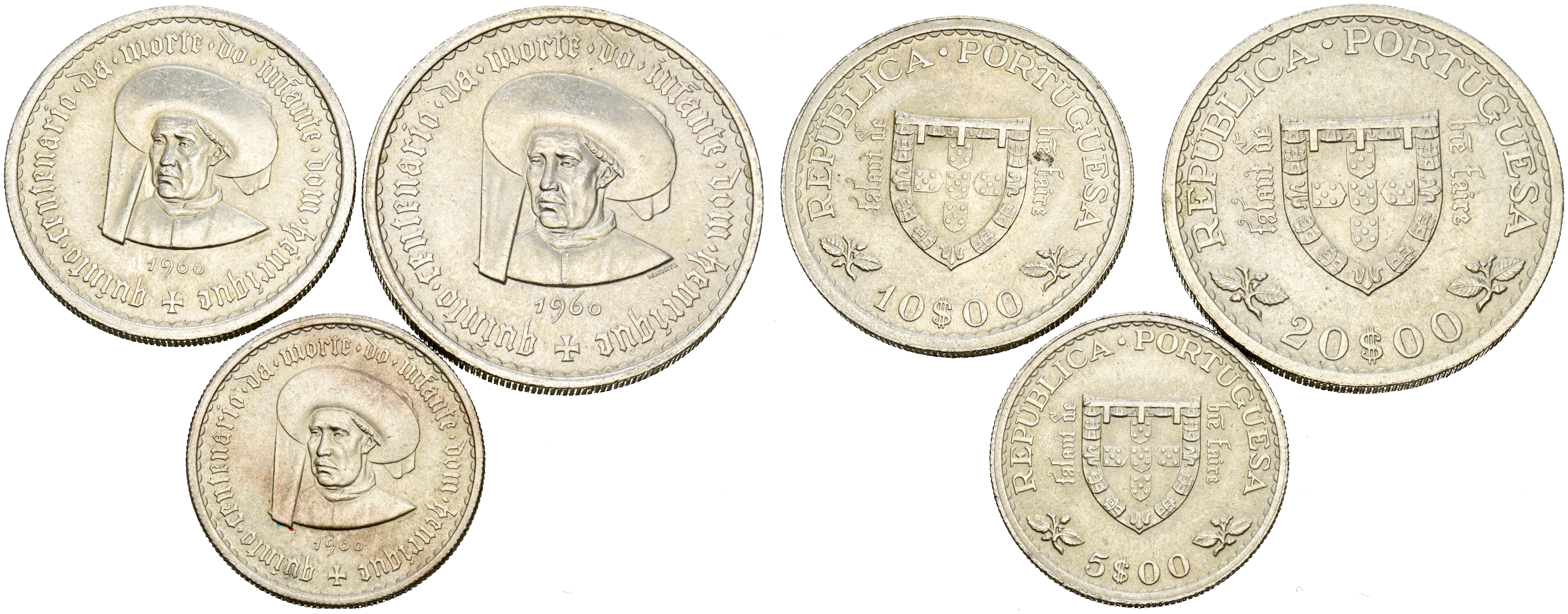 PORTUGAL. Set of 3 silver pieces with denominations of 5, 10, and 20 Escudos. 1960. King Henrique. Excellent overall condition. TO BE EXAMINED.