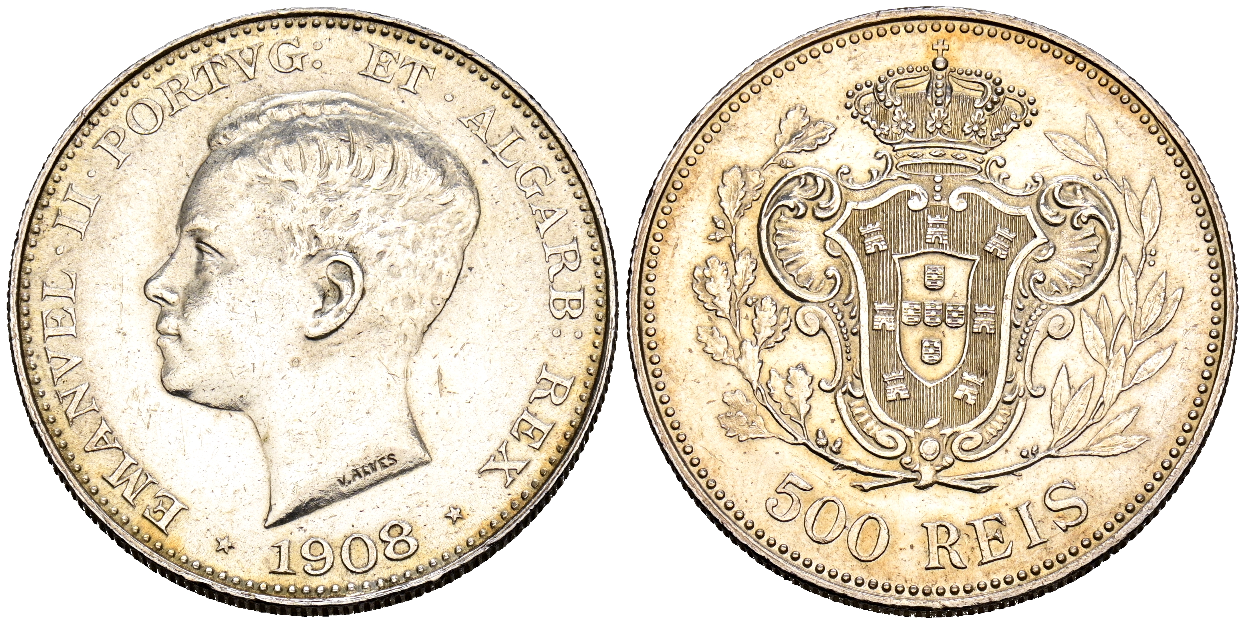 English PORTUGAL, Carlos I. 500 Reis. (Ar. 12.57g/31mm). 1908. (Gomes 11.20). EF. Cleaned.
