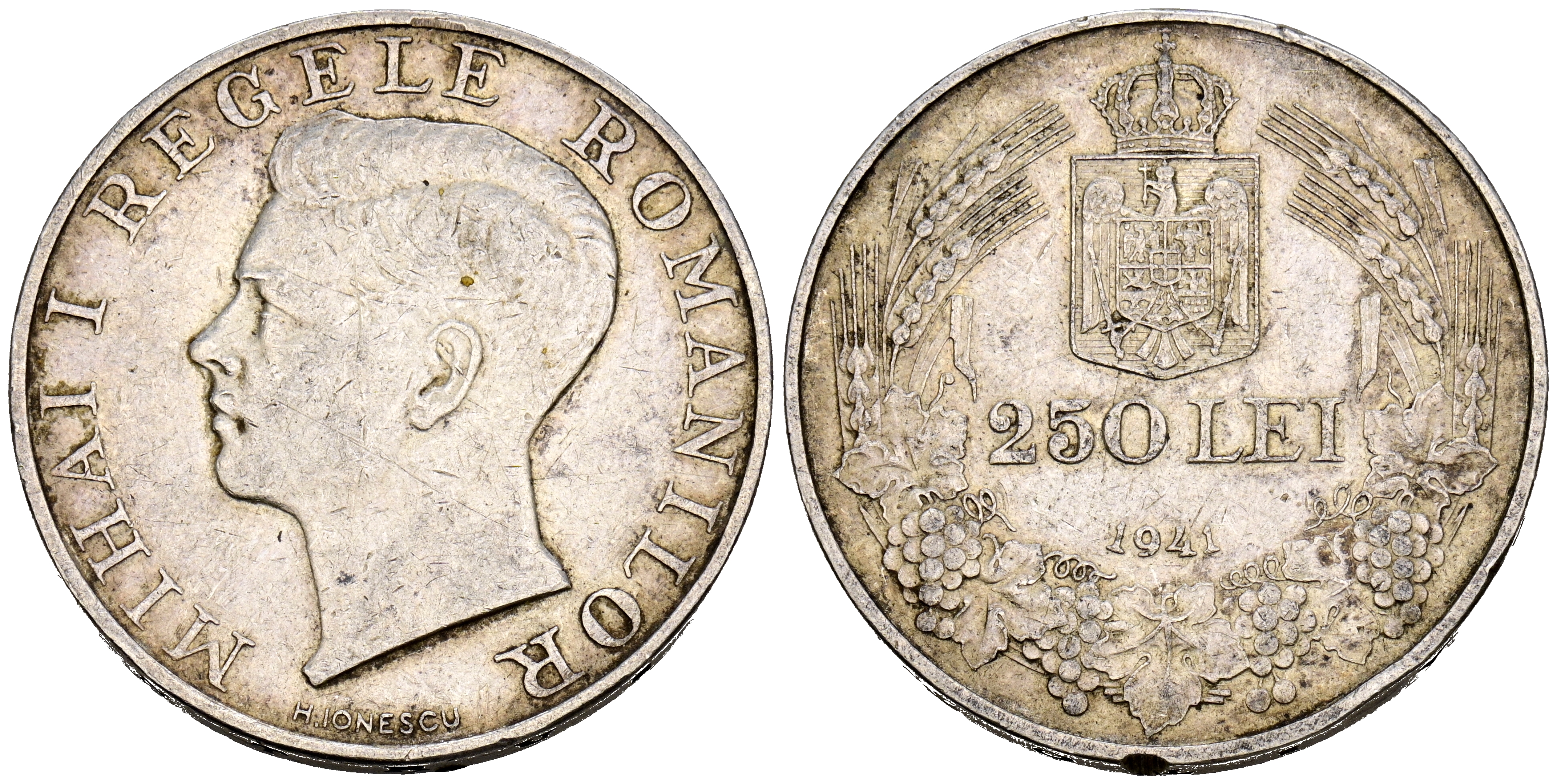 ROMANIA, Mihai I. 250 Lei. (Ar. 12.11g/30mm). 1941. (Km#59.2). Very Fine.