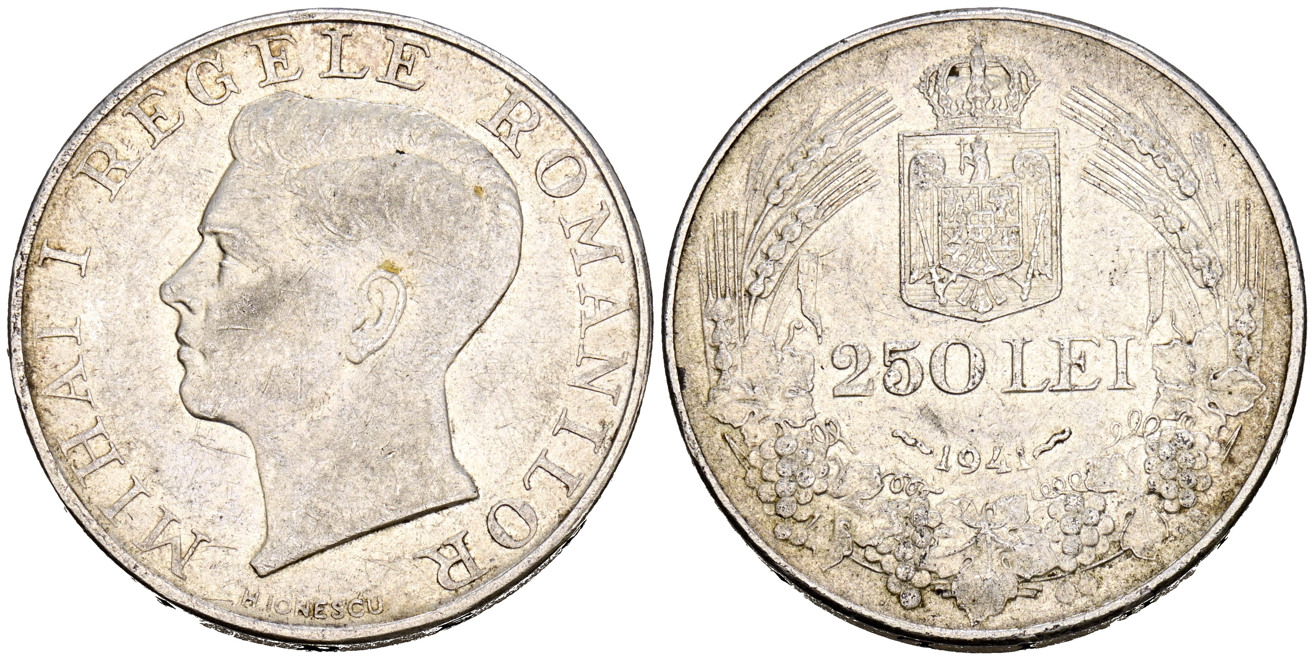English ROMANIA, Mihai I. 250 Lei. (Ar. 11.83g/30mm). 1941. (Km#59.3). Edge inscription: NIHIL SINE DEO. Good Very Fine.