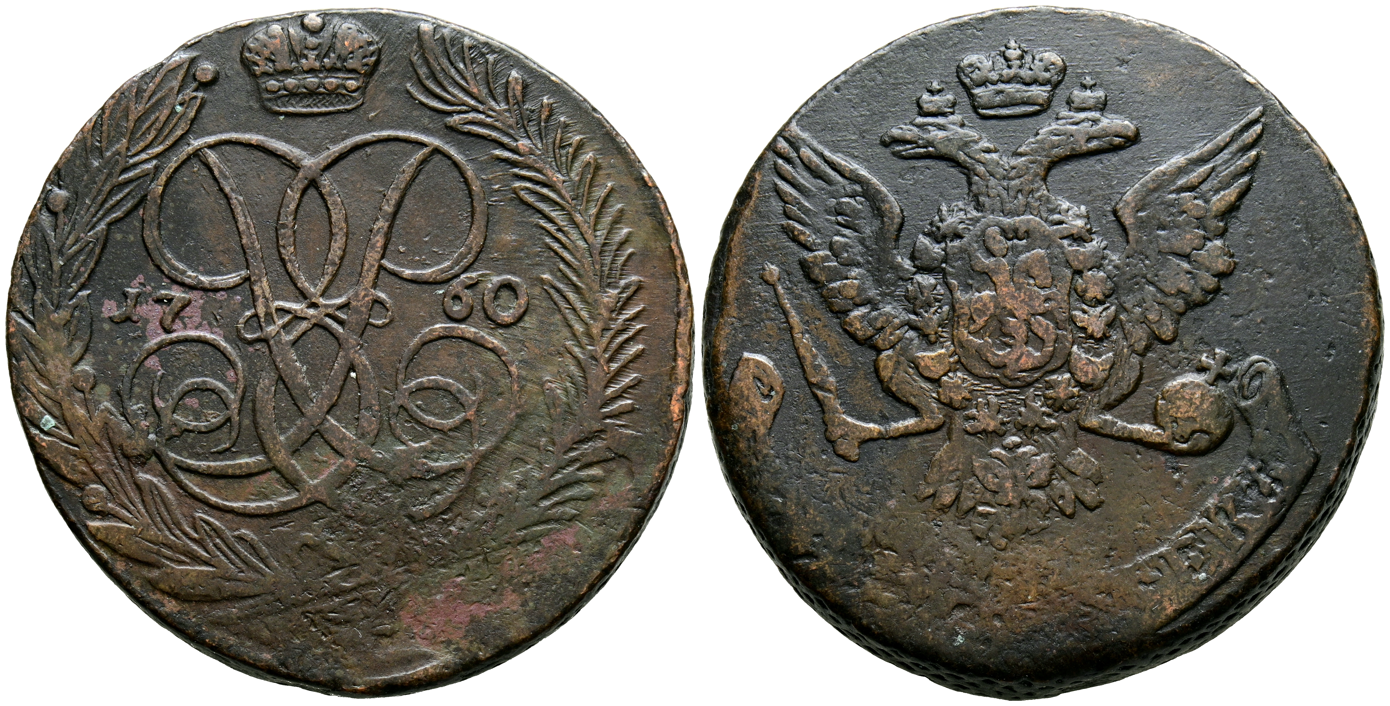 RUSSIA, Elizabeth I (1741-1762). 5 Kopeks. (Ae. 48.87g/41mm). 1760. Yekaterinburg. (Km#C9.2). Very Fine.