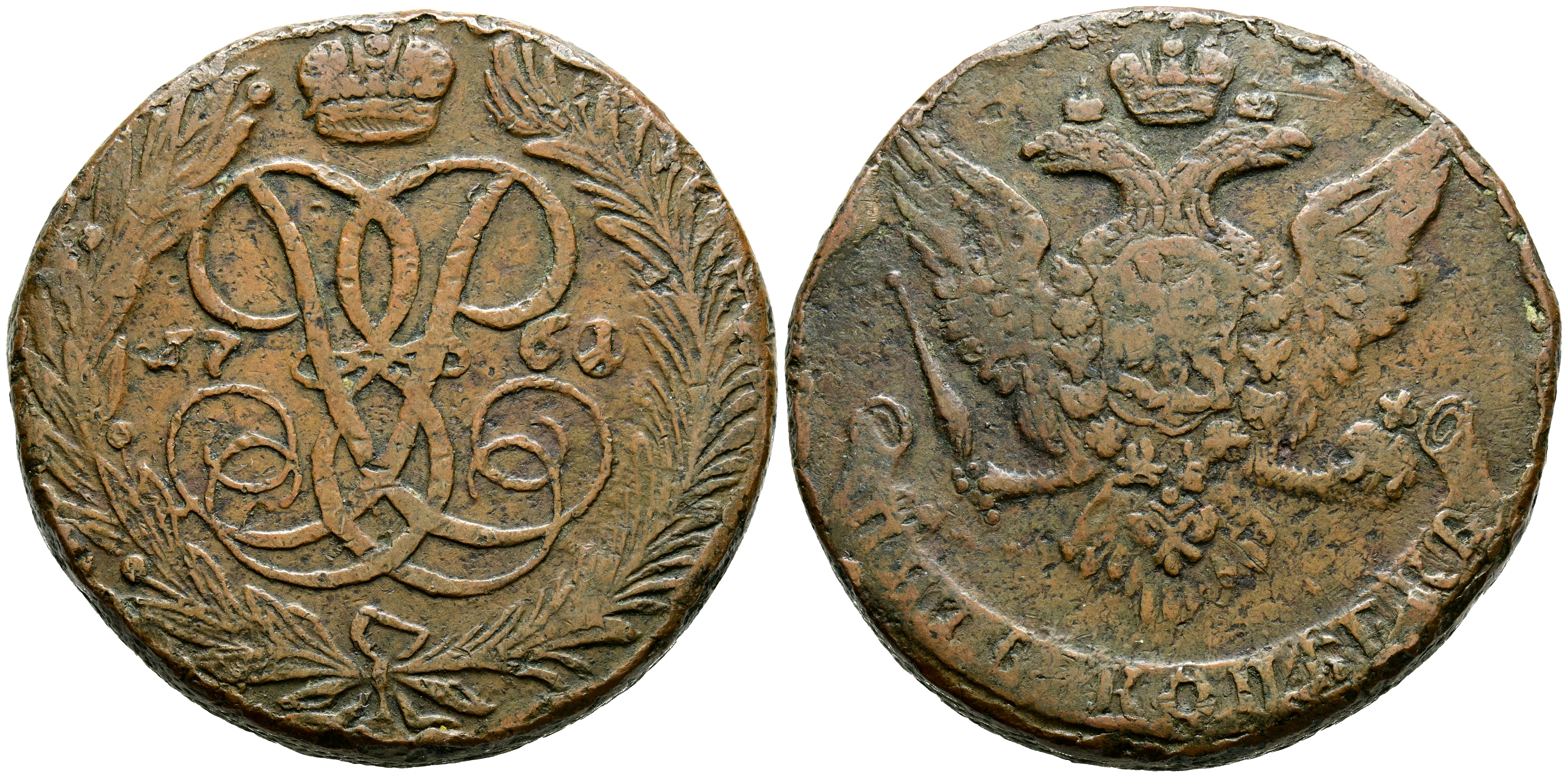 English RUSSIA, Elizabeth I (1741-1762). 5 Kopeks. (Ae. 57.77g/42mm). 1761/0. Ekaterinburg. (Km#C9.2-var). VF-. Minor date correction.