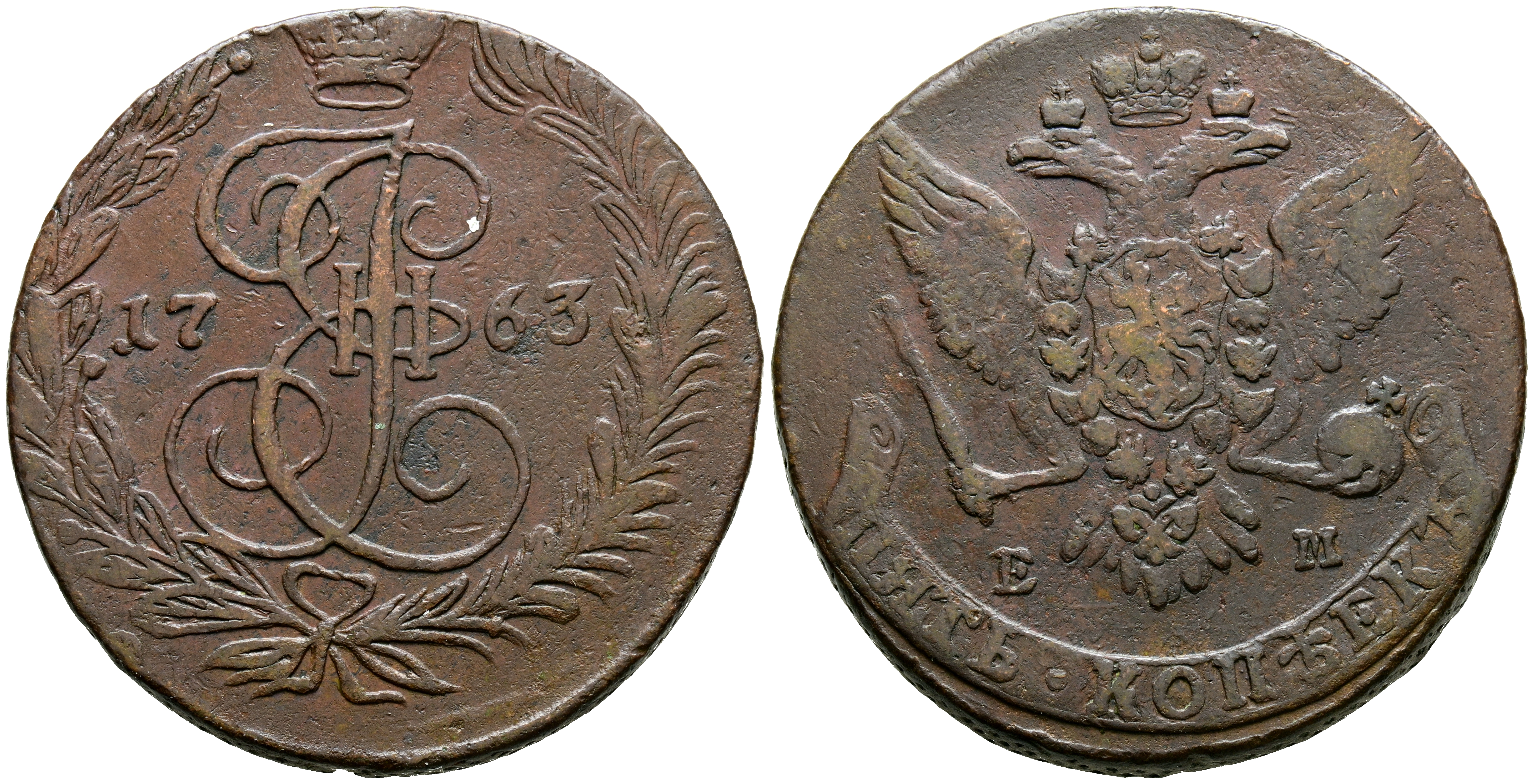 RUSSIA, Catherine II (1762-1796). 5 Kopeks. (Ae. 41.06g/41mm). 1763. Yekaterinburg EM. (Km#C59). Very Fine.