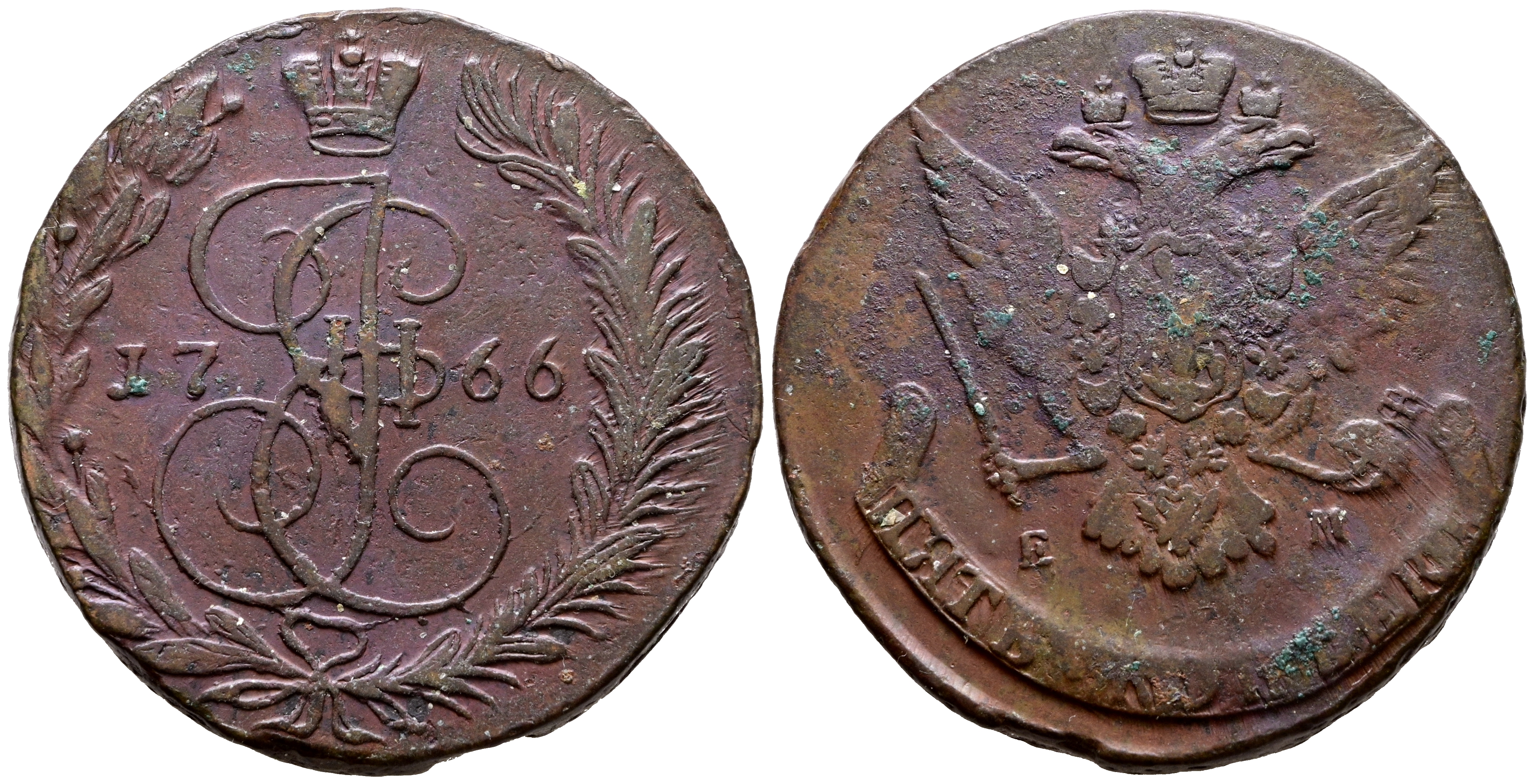 English RUSSIA, Catherine II (1762-1796). 5 Kopeks. (Ae. 47.68g/42mm). 1766. Yekaterinburg EM. (Km#C59). Very Fine.