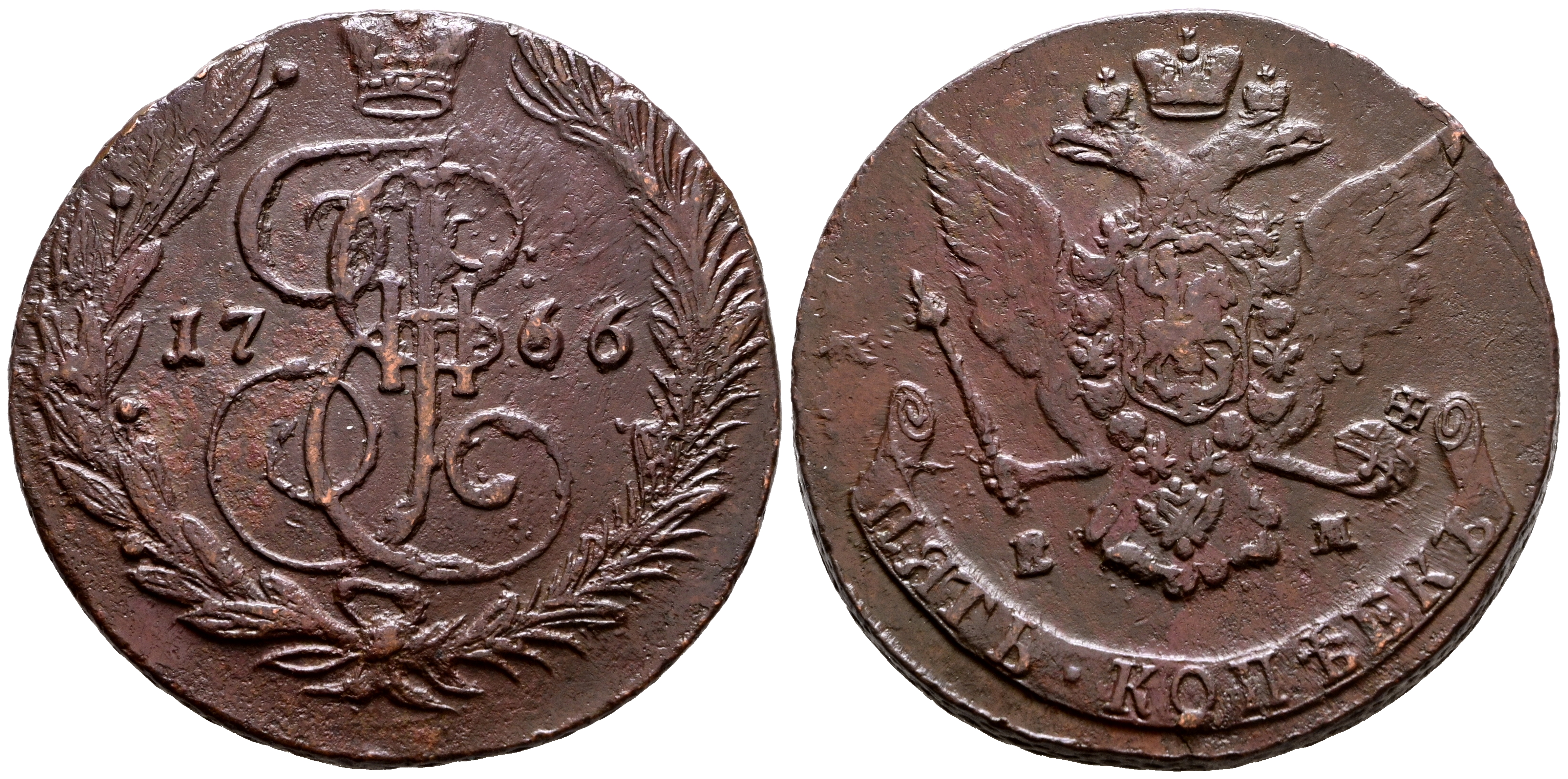 RUSSIA, Catherine II (1762-1796). 5 Kopeks. (Ae. 47.09g/42mm). 1766. Yekaterinburg EM. (Km#C59). Good Very Fine.