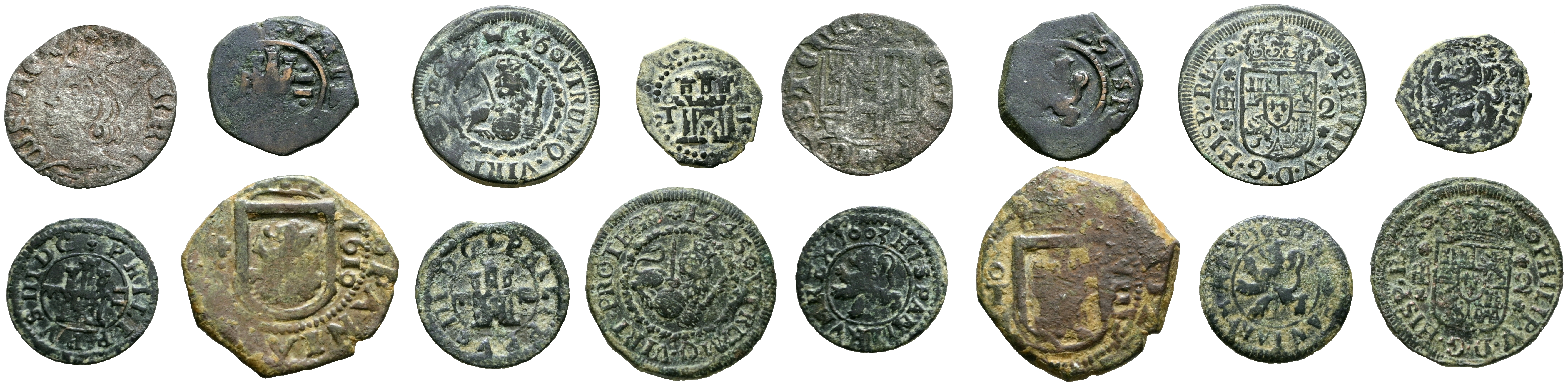 SPANISH MONAGoodHY. Interesting set of 8 copper coins minted during the reigns of Philip III, Philip IV, and Philip V. Mints of Segovia and Toledo. 2 Maravedís (6 pieces) and 8 Maravedís (1) denominations. Includes a medieval cornado of Henry II. Various states of preservation. TO BE EXAMINED.