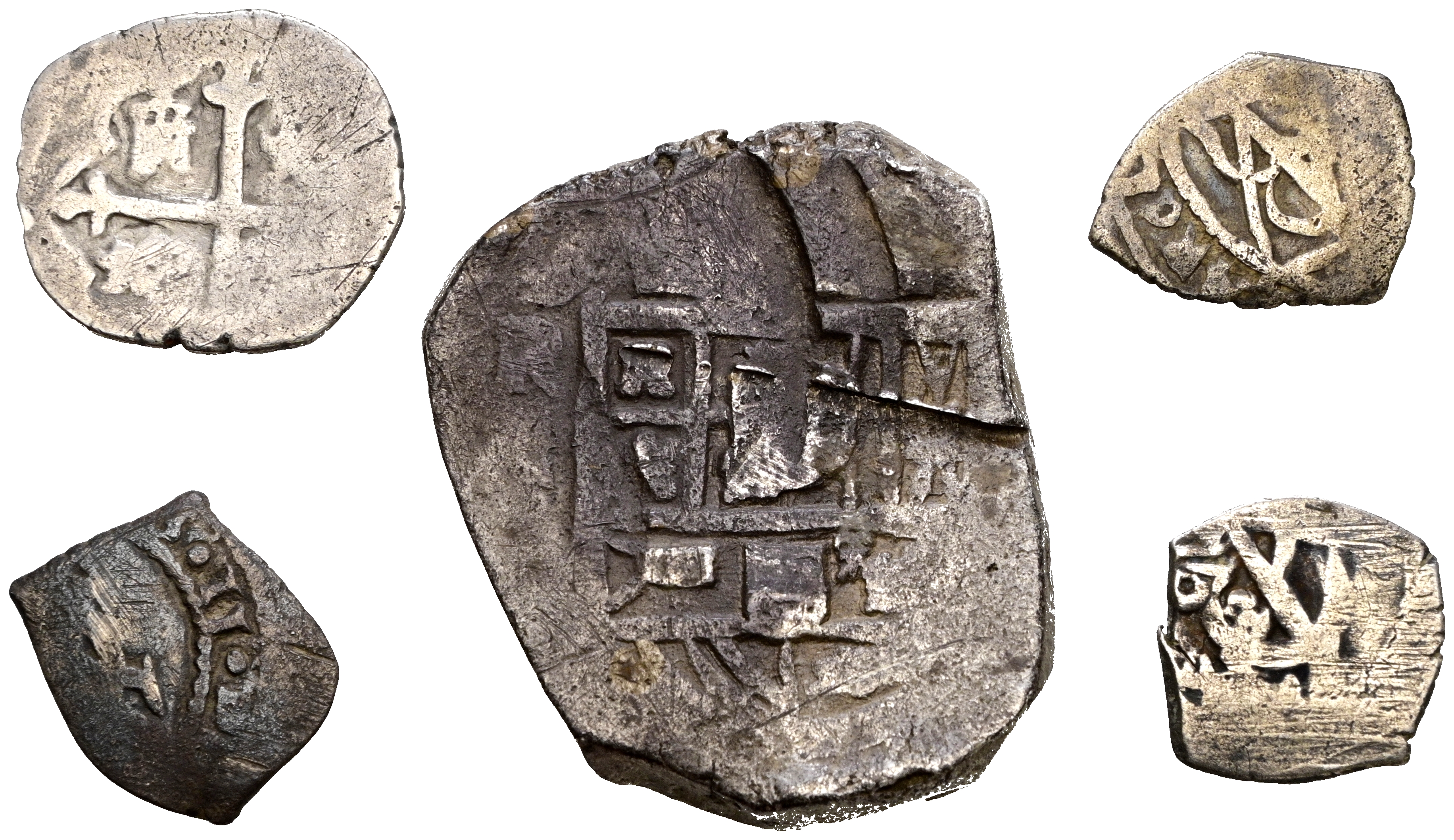 SPANISH MONAGoodHY. Interesting set of 5 cob coins, minted during the reigns of Philip V and Charles II with different dates and sizes, including an 8-real coin. Various states of preservation. ESSENTIAL EXAMINATION