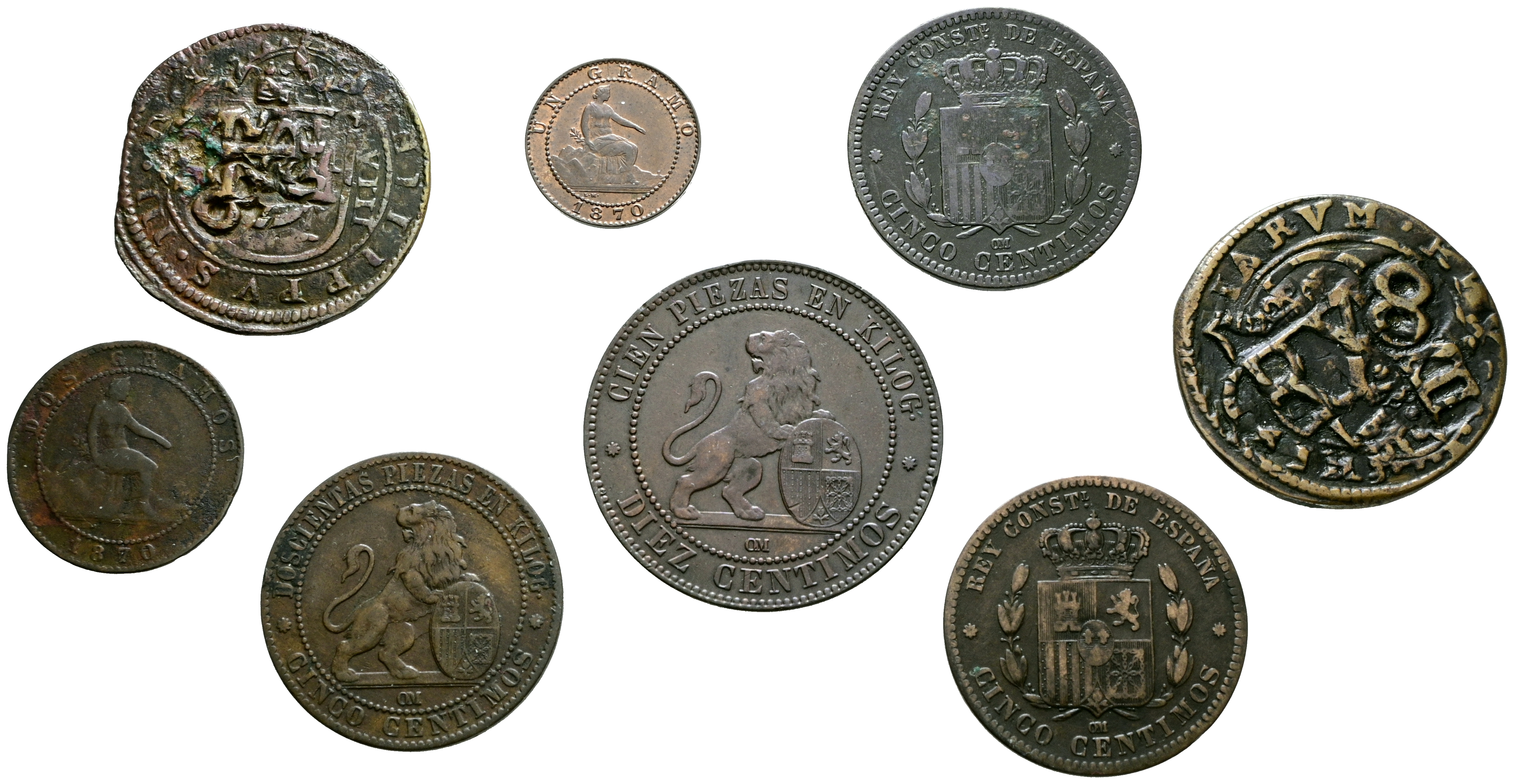 MONARQUÍA ESPAÑOLA Y CENTENARIO DE LA PESETA. Interesante conjunto de 8 cobres de ambos periodos con variedad de módulos, fechas así como estados de conservación. Incluye un par de piezas reselladas. Sin piezas repetidas. A EXAMINAR.