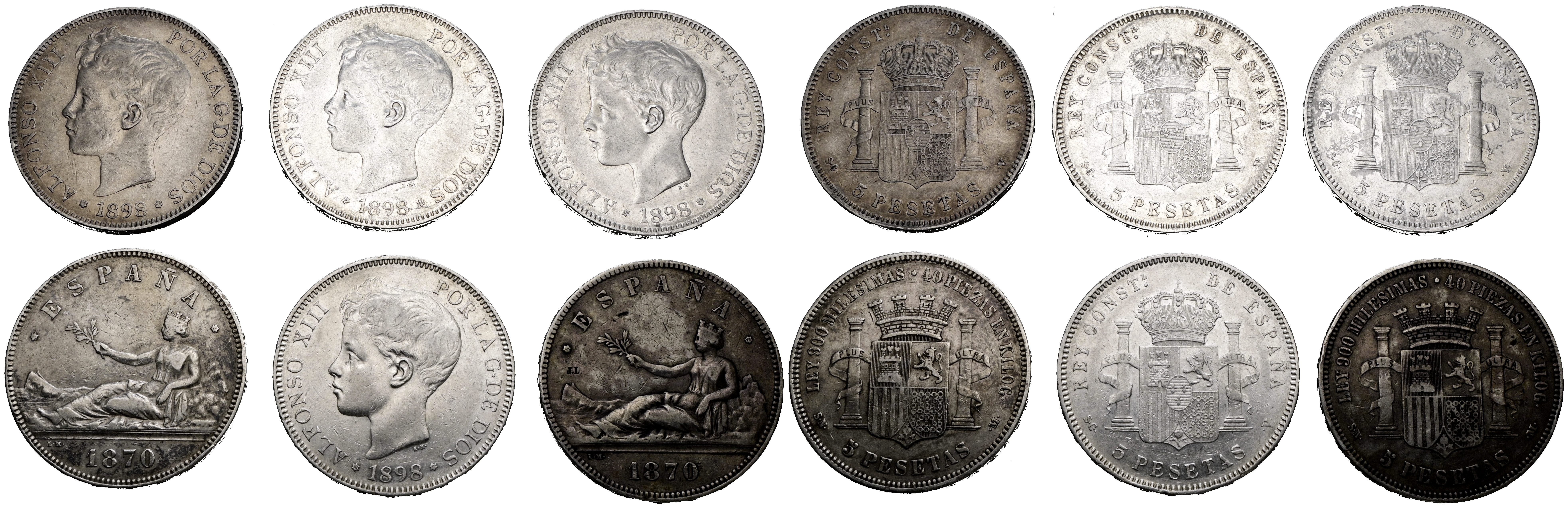 English Centenary of the Peseta. Set of 6 coins with a 5-peseta denomination, minted in 1870 by the Provisional Government and in 1898 by Alfonso XIII. Good overall condition. To be examined.