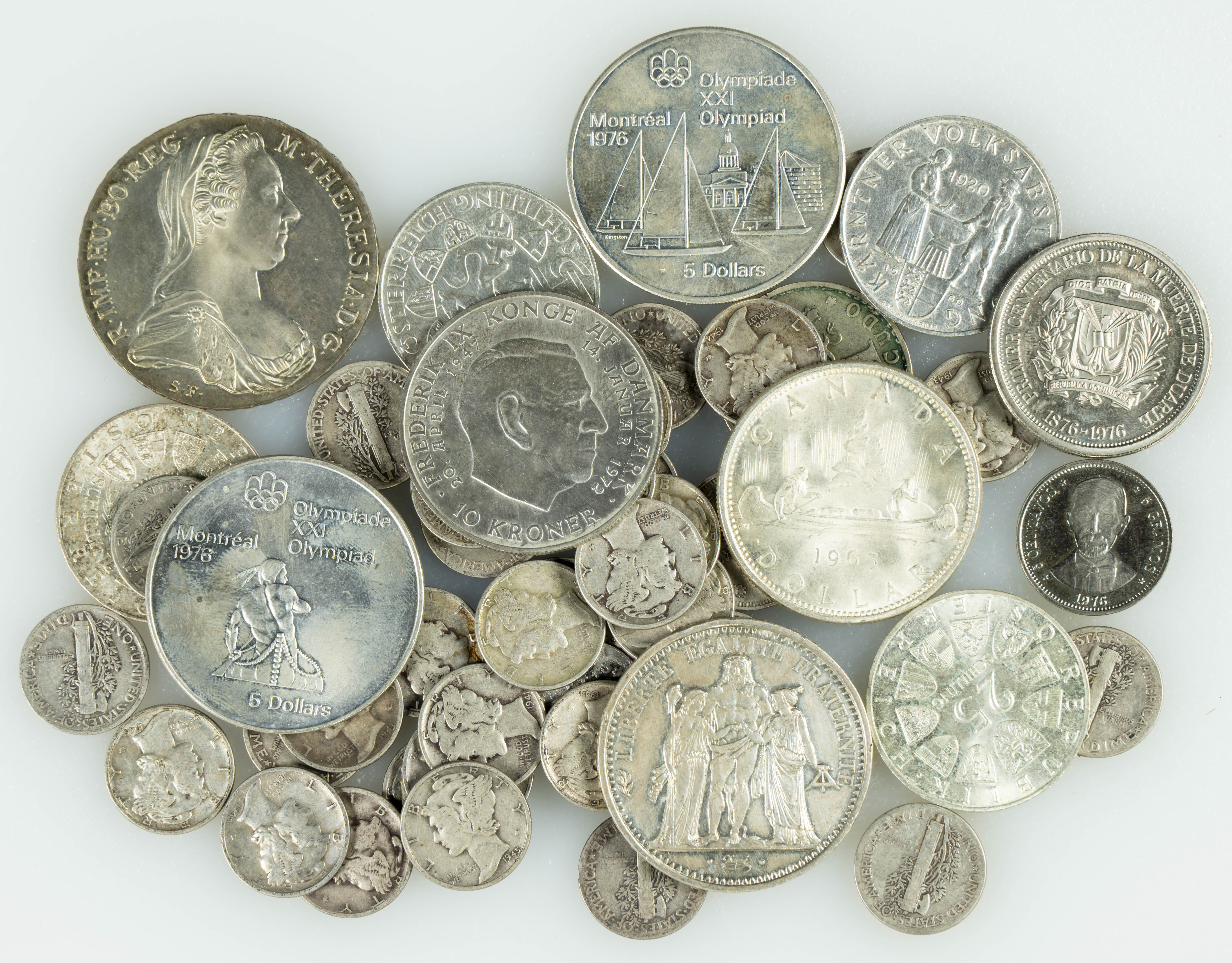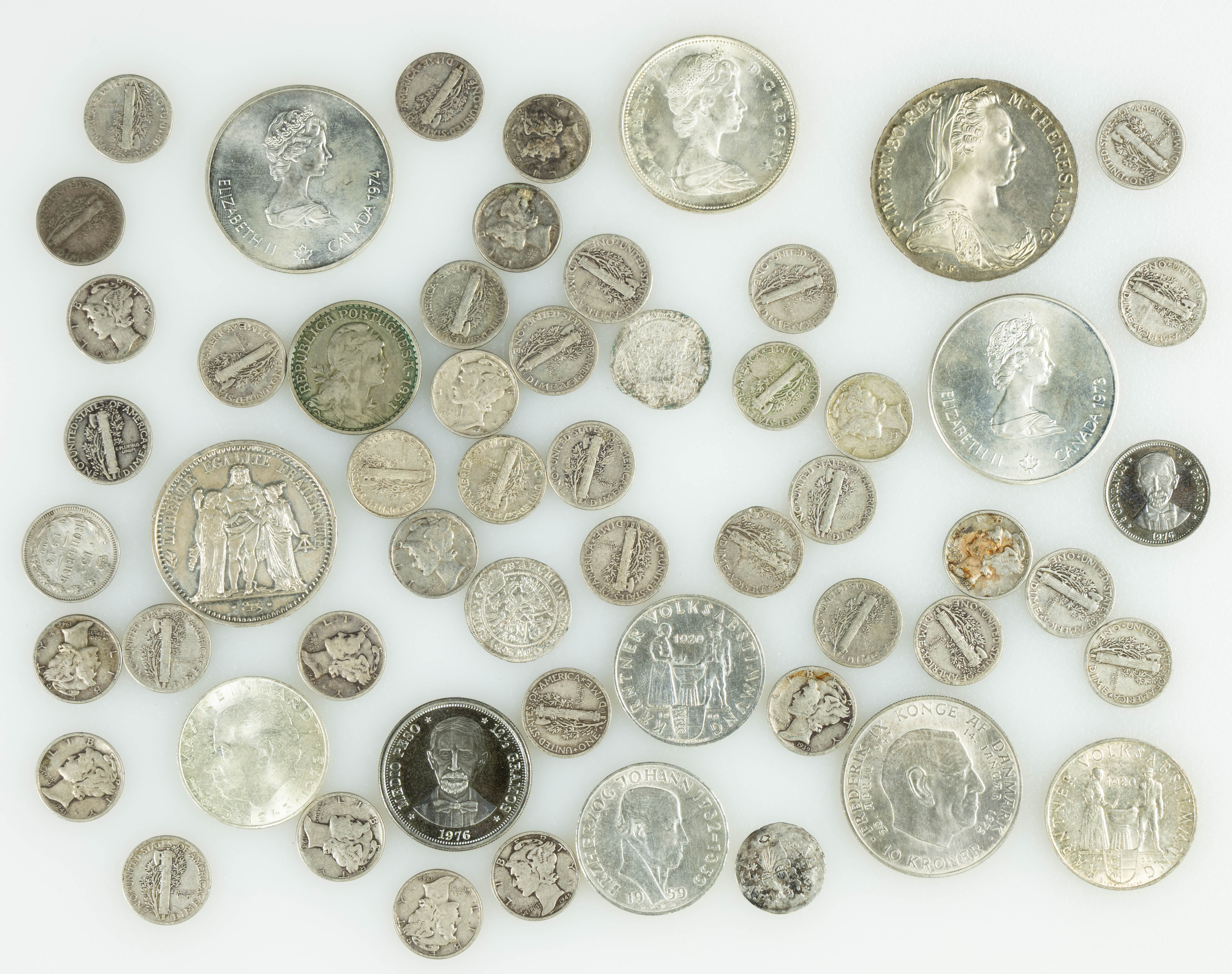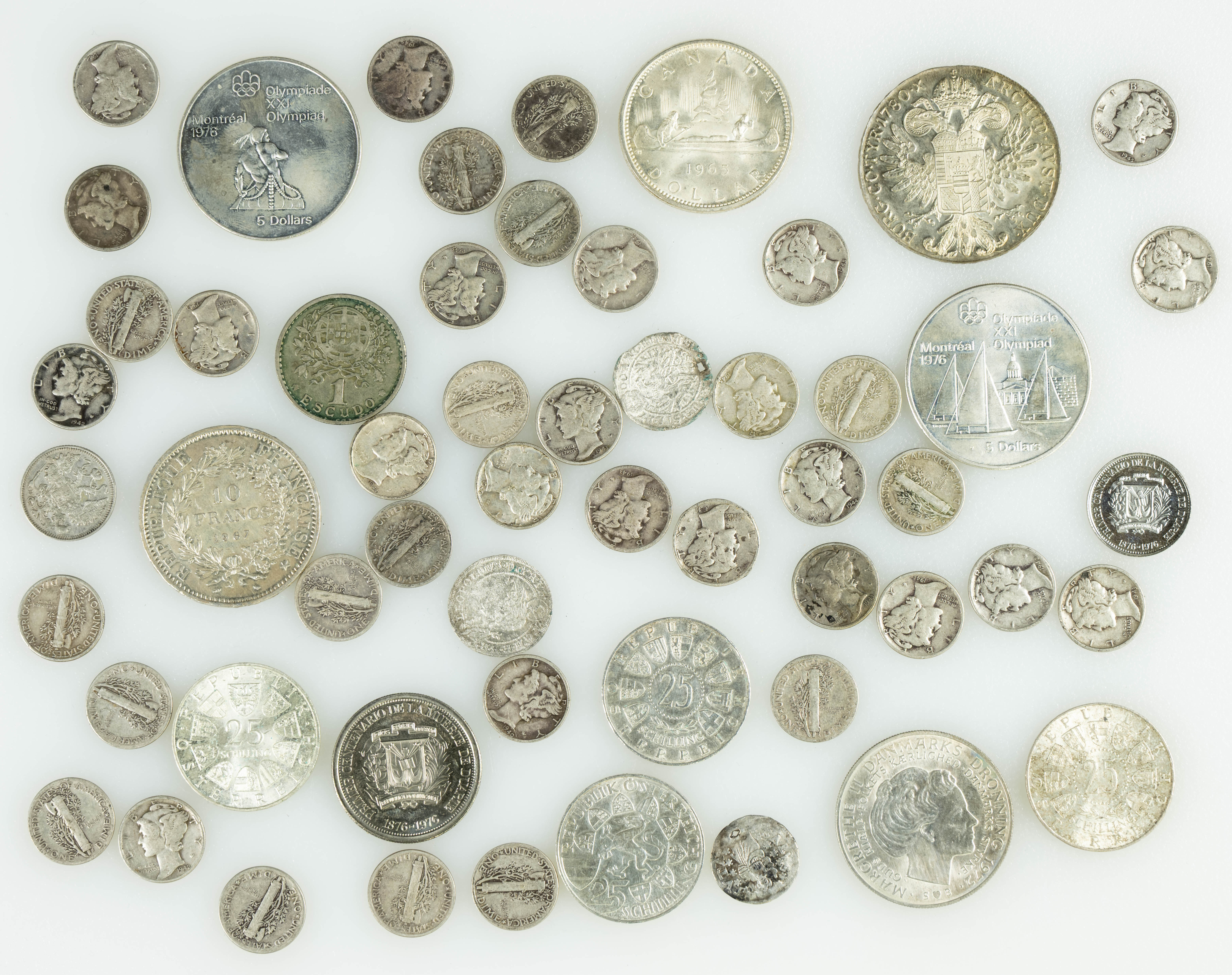 FOREIGN COINS. Collection of over 50 coins, primarily from the 20th century, mostly silver, from various countries, denominations, and dates. Various states of preservation. TO BE EXAMINED.