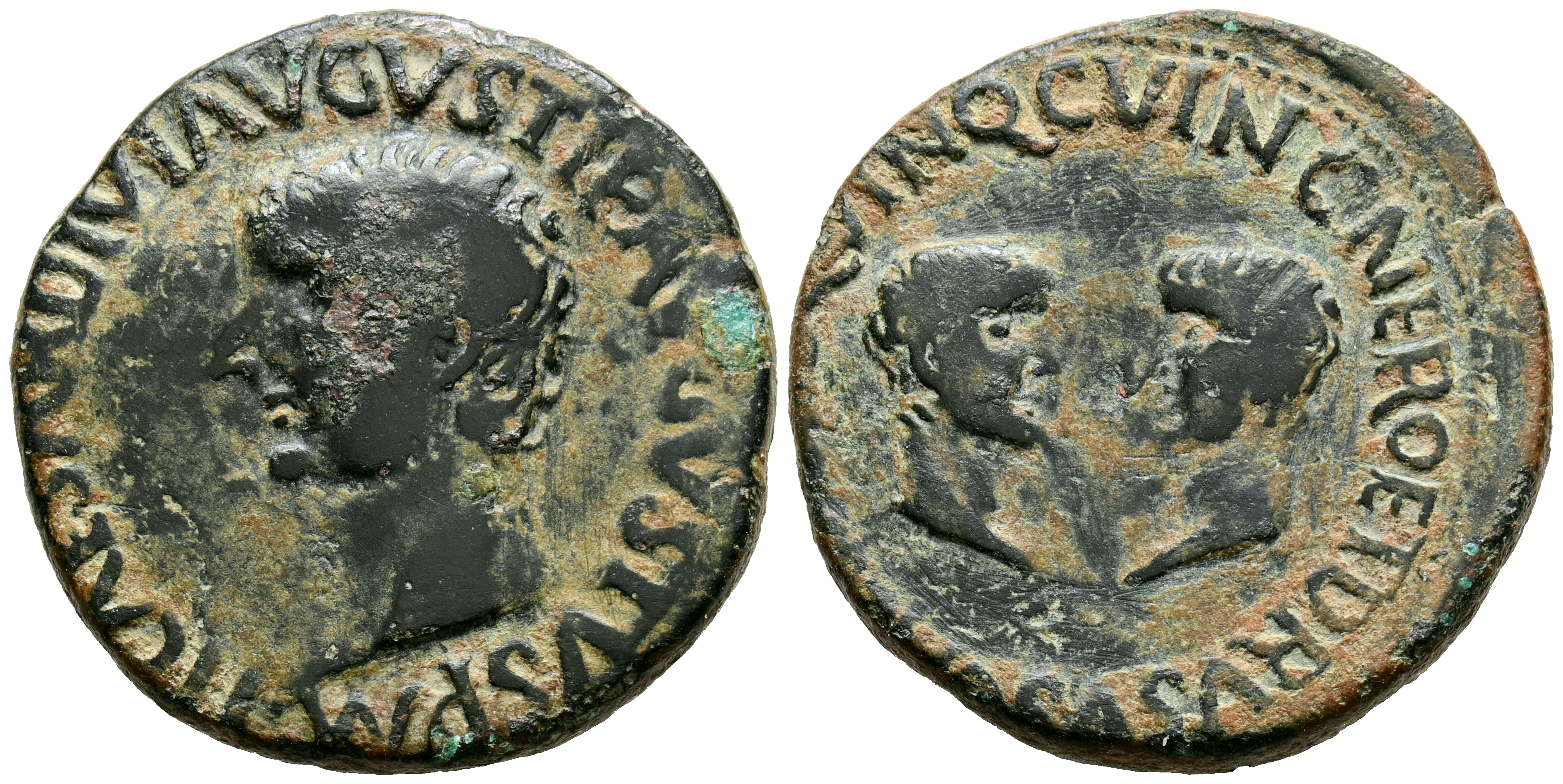 CARTAGONOVA (Cartagena, Murcia). As. (Ae. 13.40g/30mm). 14-36 AD (FAB-600). Anv: Head of Tiberius to the left, around legend: TI CAESAR DIVI AVGVSTI F AVGVSTVS. Rev: Facing heads of Nero and Drusus, around legend: NERO ET DRVSO CAESARES QVINQ CVIN C. Very Fine.