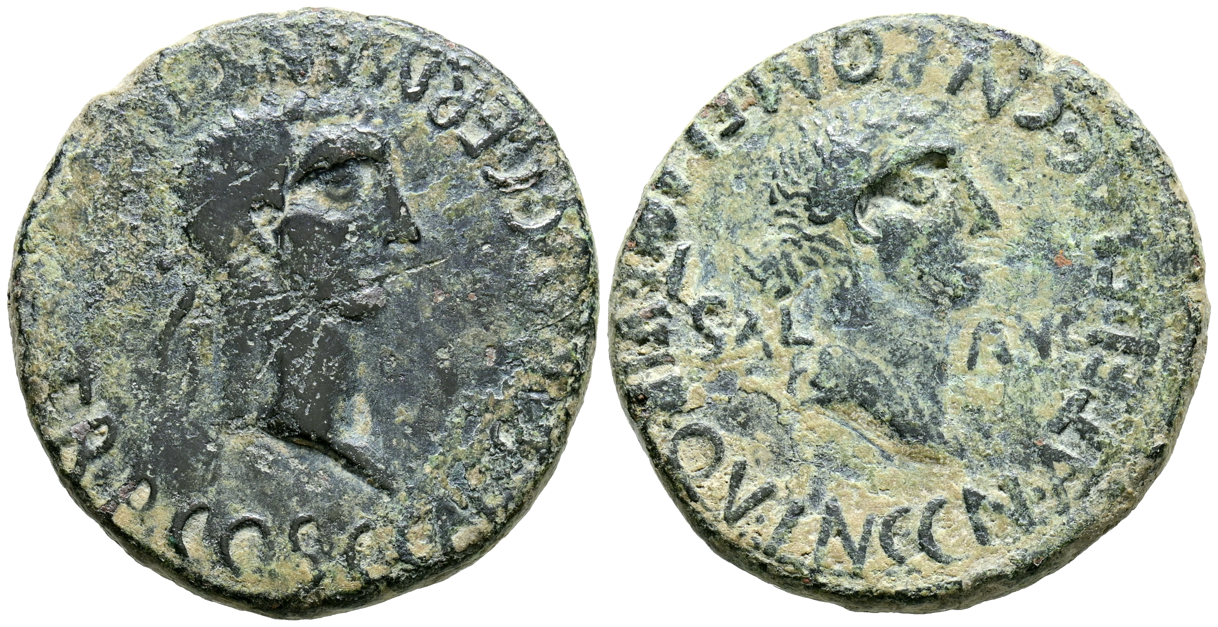 English CARTAGONOVA (Cartagena, Murcia). As. (Ae. 11.22/28mm). 37-41 AD (FAB-613). Obv: Laureate head of Caligula facing right, around legend: C CAESAR AVG GERMANICA IMP PM TR P COS. Rev: Laureate head of Caesonia, on either side: SAL-AVG, around legend: CN ATEL FLAC CN POM FLAC II VIR. Good Fine/Very Fine-.