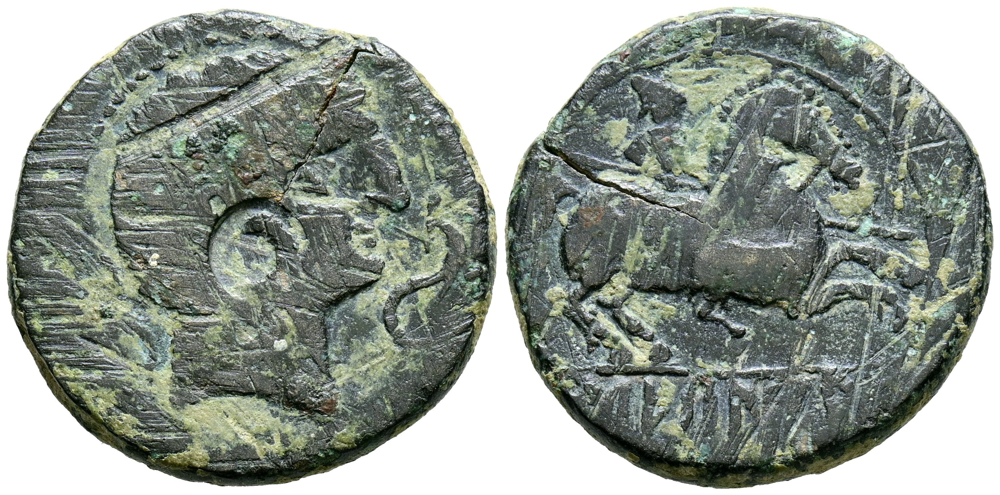 SECAISA (Segeda, Zaragoza). As. (Ae. 9.05g/24mm). 120-20 Fine (FAB-2131). Obv: Male head facing right, between two dolphins. Rev: Horseman with spear facing right, below Iberian legend: SECaISA. Fine.
