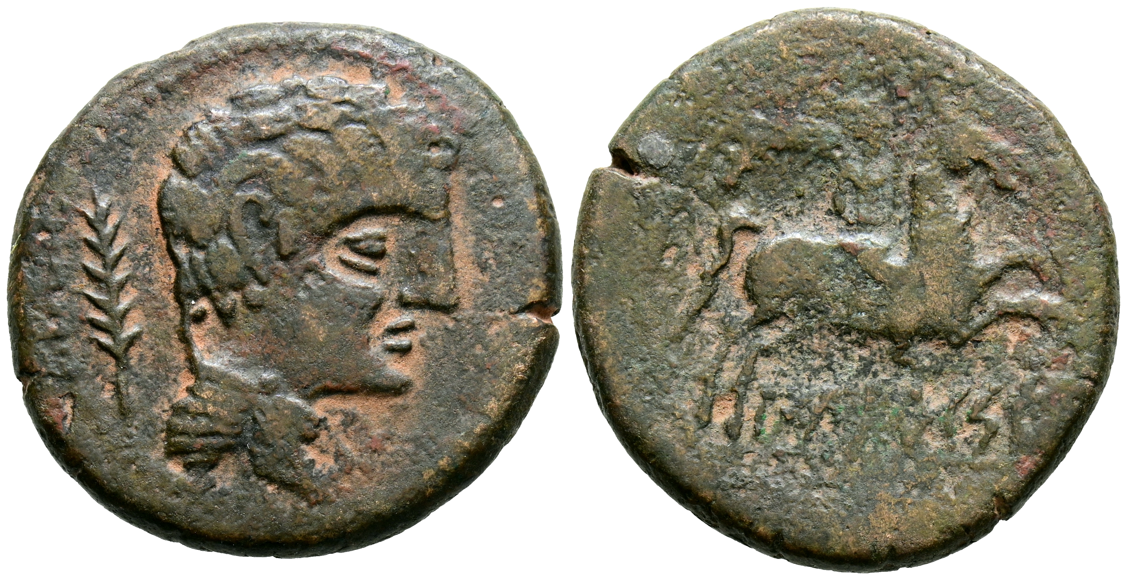 ILTIGoodEUncirculatedEN (Lérida). As. (Ae. 11.52g/27mm). 120-20 Fine (FAB-1446). Obv: Male head facing right, ear of wheat behind. Rev: Horseman with palm facing right, legend below: ILTIGoodEUncirculatedEN. VF/Good Fine.