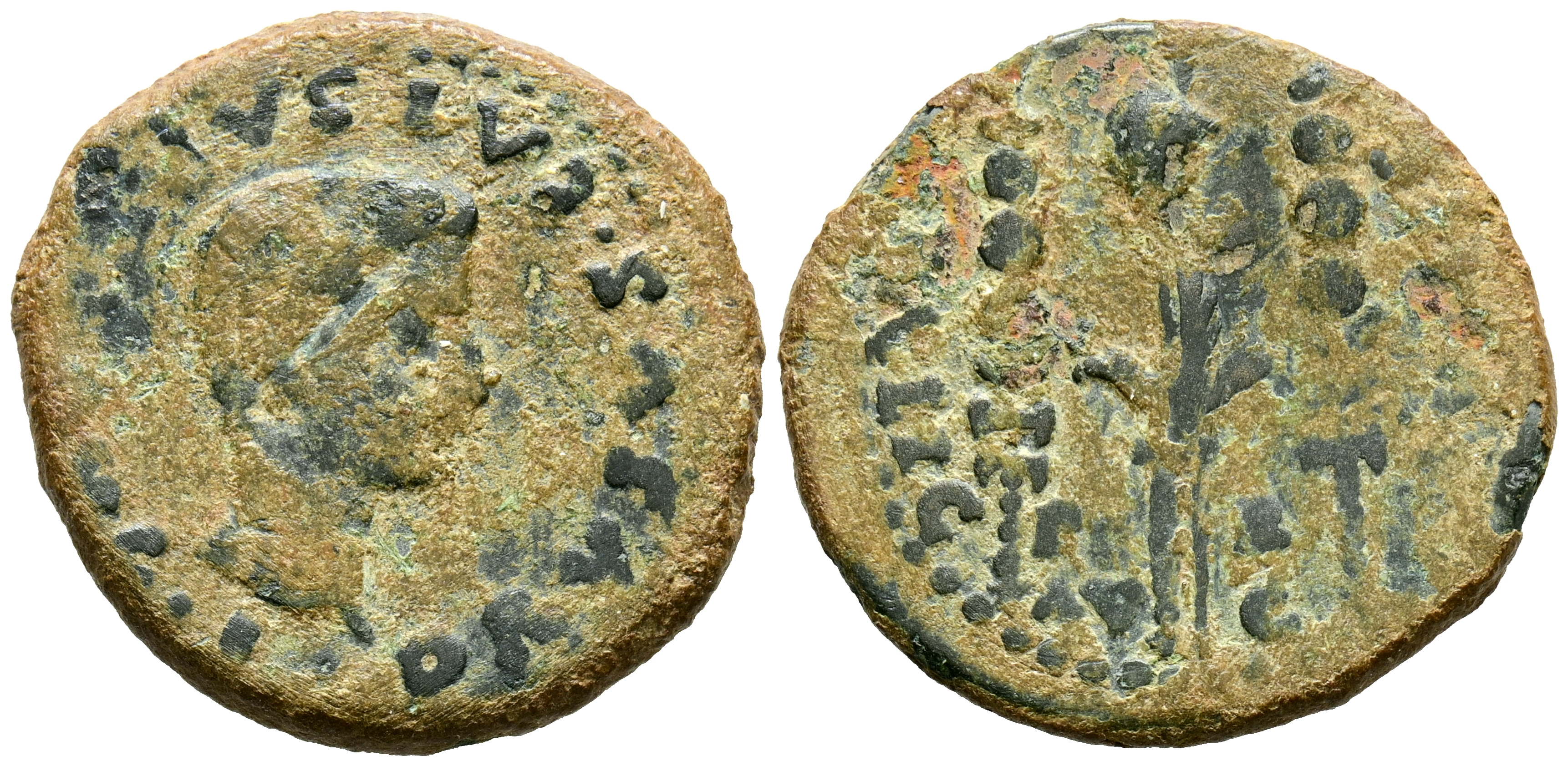 ITALICA (Santiponce, Seville). Semis. (Ae. 6.52g/24mm). 14-36 AD (FAB-1596). Obv: Head of Drusus facing right, around the legend: DRVSVS CAESAR TI AVG. Rev: Standards, including legionary eagle, including: PER / AVG, around the legend: MVNIC ITALIC. Very Fine.
