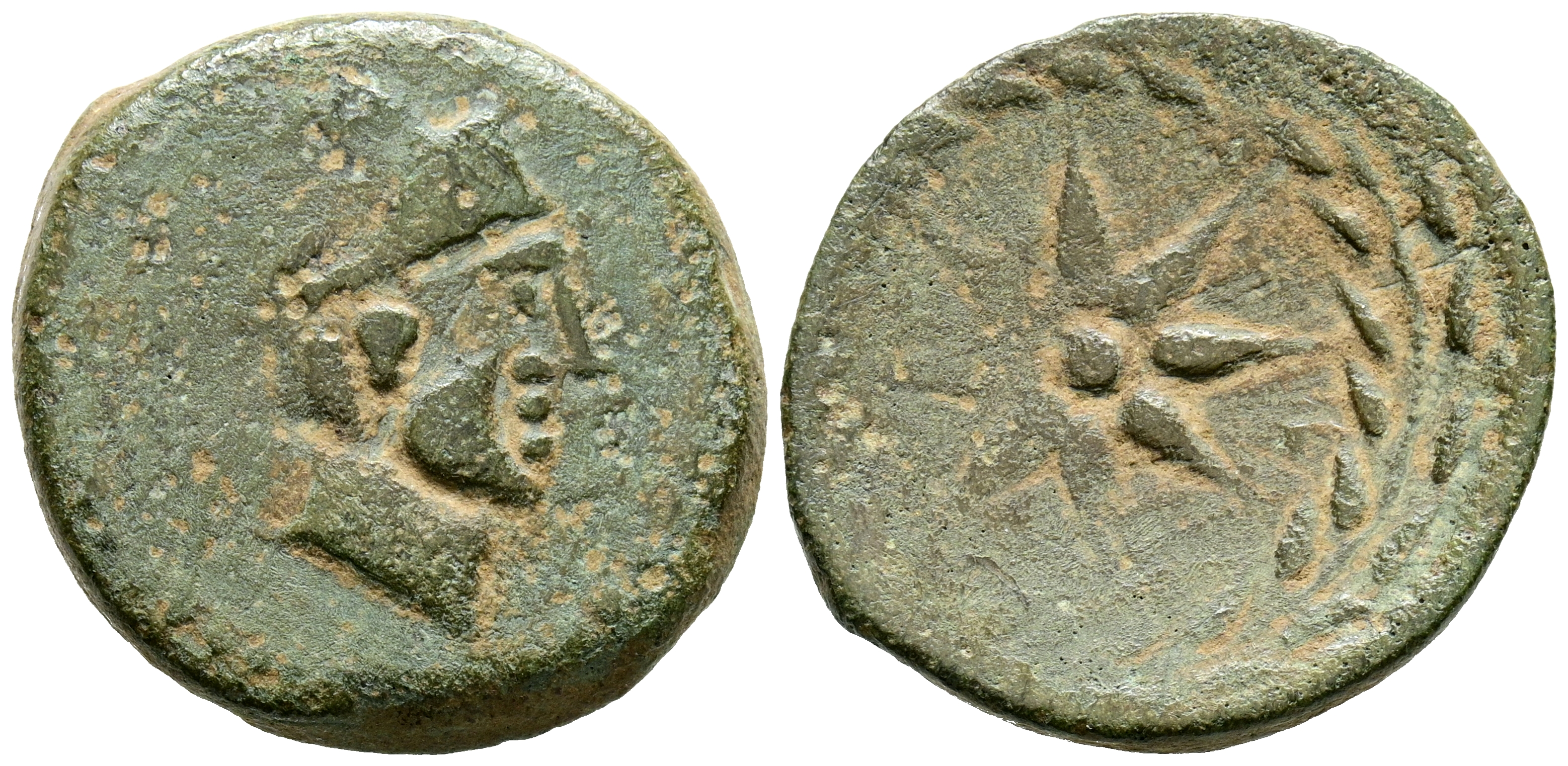 MALACA (Málaga). Semis. (Ae. 6.22g/22mm). 200-20 Fine (FAB-1733). Obv: Head of Vulcan facing right, behind the Punic legend and pincers. Rev: Eight-pointed star within a laurel wreath. VF-.