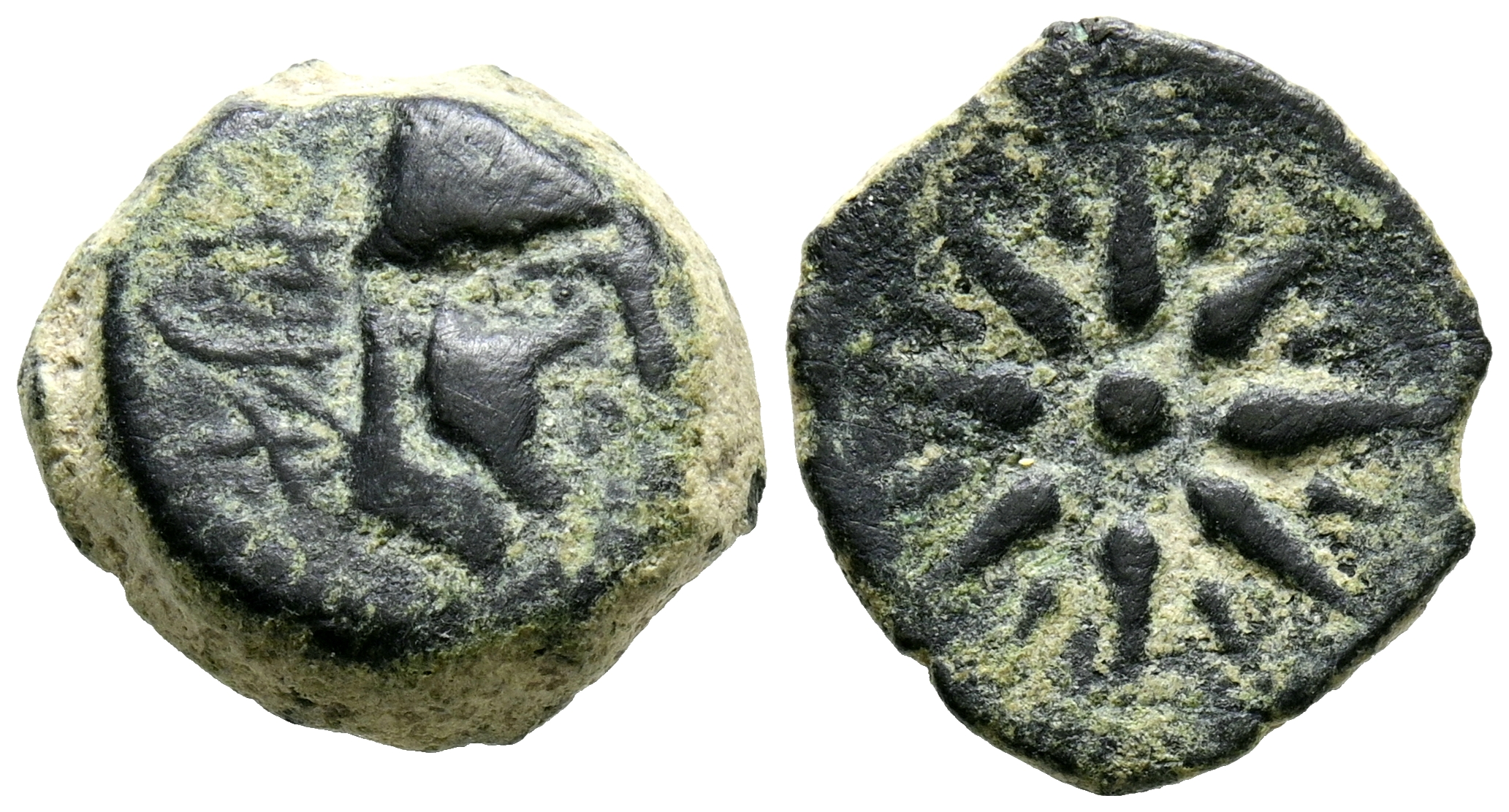 MALACA (Málaga). Sextant. (Ae. 2.88g/15mm). 200-20 Fine (FAB-1744). Obv: Head of Vulcan facing right, behind Punic legend type A. Rev: Eight-rayed star. VF.