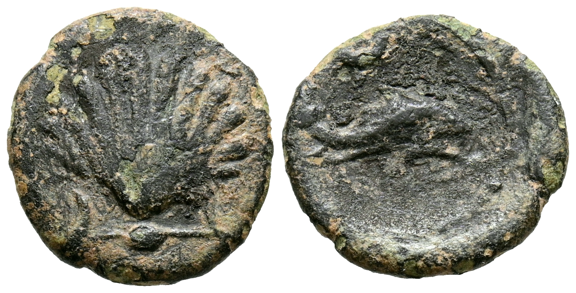 ARSE-SAGUNTO (Sagunto, Valencia). Sextant. (Ae. 1.06g/13mm). 170-20 Fine (FAB-2065). Obv: Shell. Rev: Dolphin to right, above crescent. VF.