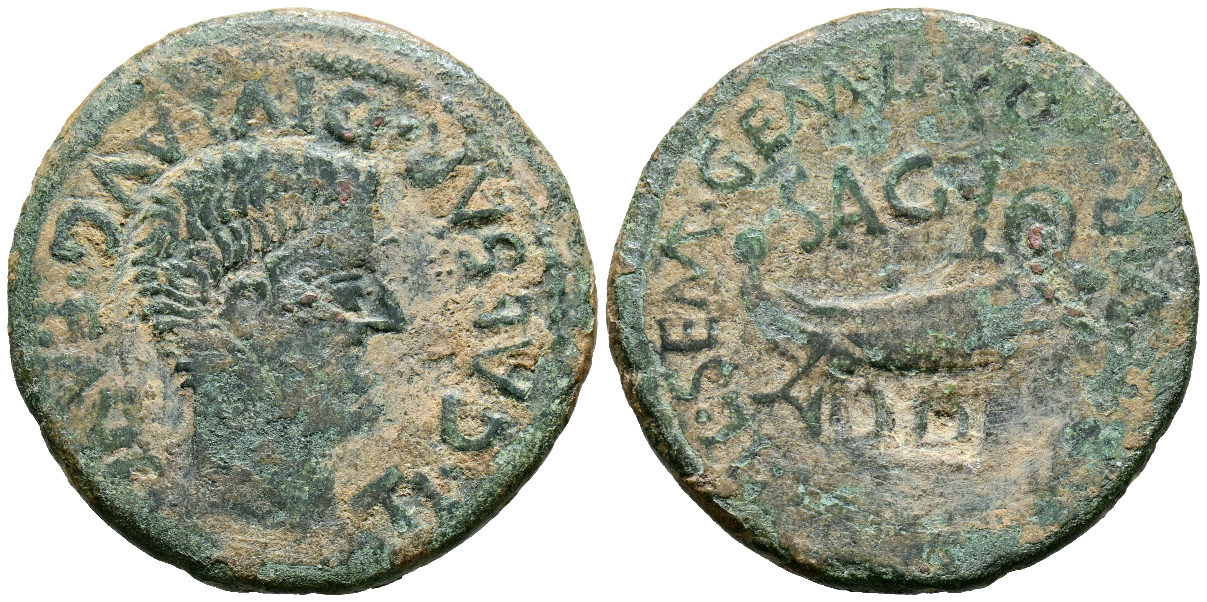 ARSE-SAGUNTO (Sagunto, Valencia). As. (Ae. 8.13g/27mm). 14-36 AD (FAB-2091). Obv: Head of Tiberius facing right, around legend: TI CAESAR DIVI AVG F AVG. Rev: Ship, above SAG, around legend: L AE MAXIMO M BAEB SOBRINO AED. Very Fine-. Countermark DD on reverse.