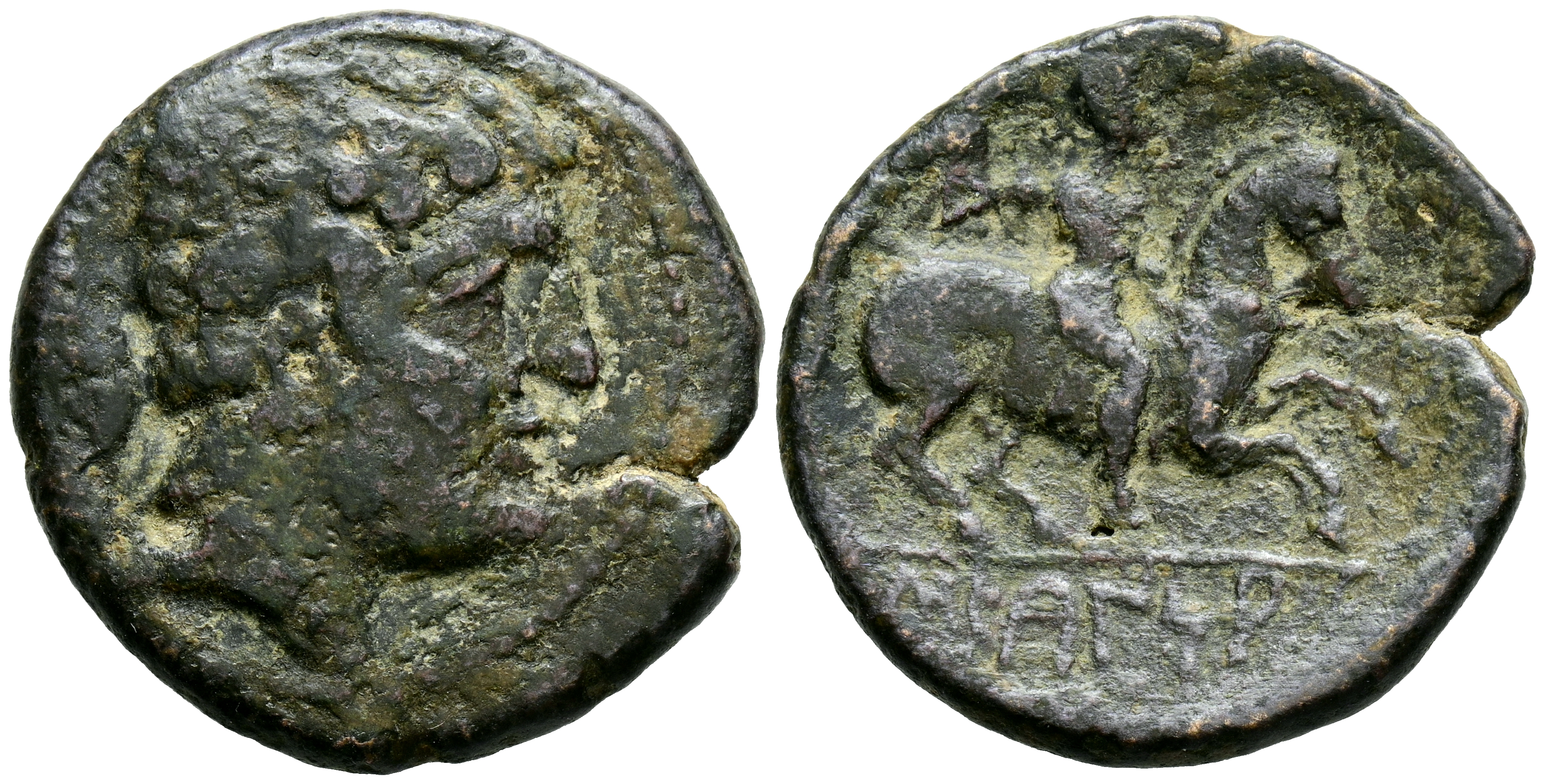 SECAISA (Segeda, Zaragoza). As. (Ae. 8.93g/26mm). 120-20 Fine (FAB-2131). Obv: Male head right between dolphins. Rev: Horseman with spear right, below legend underline: SECaISA. VF.