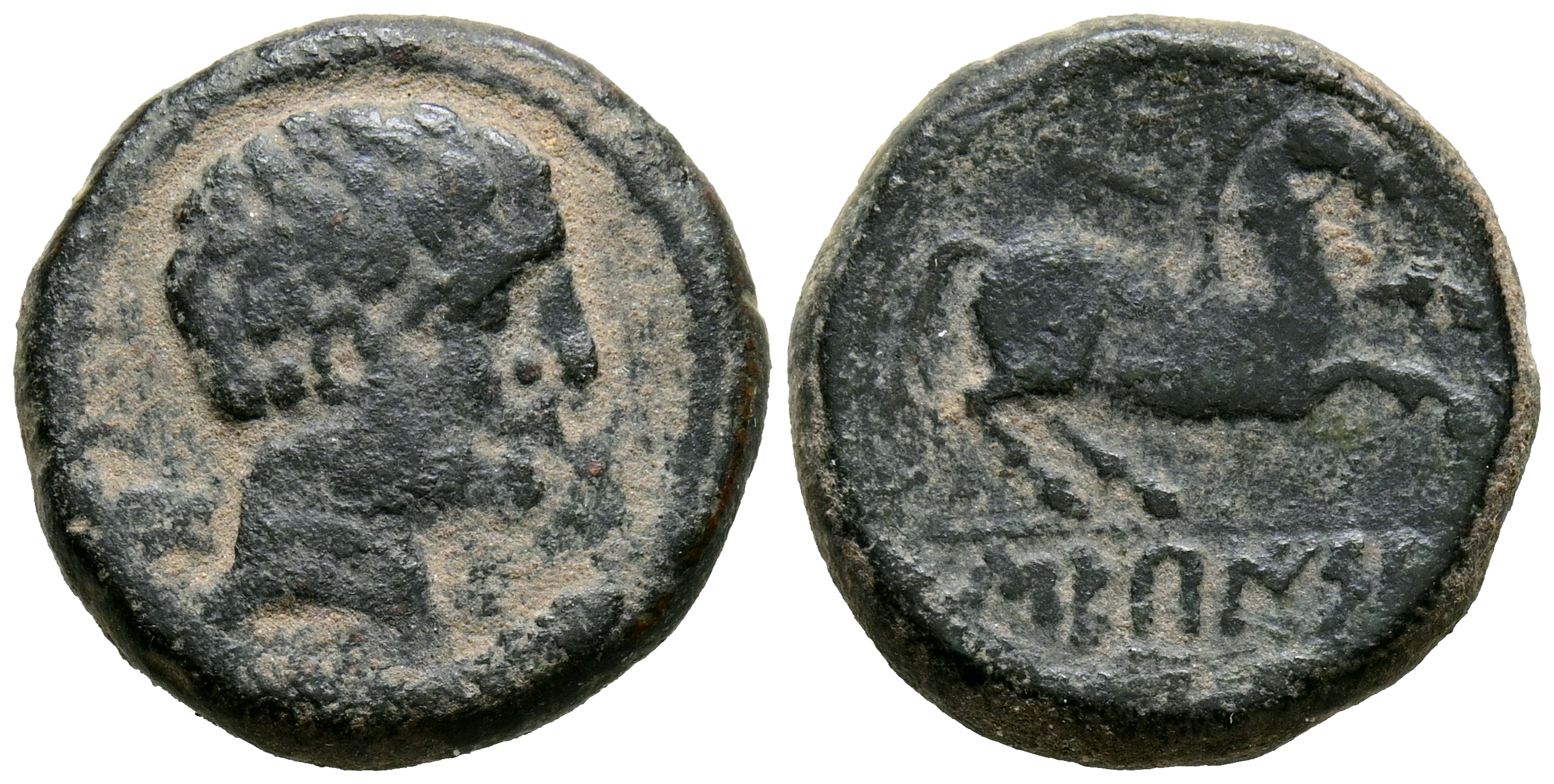 SECAISA (Segeda, Zaragoza). Semis. (Ae. 4.64g/18mm). 120-20 Fine (FAB-2144). Obv: Male head facing right, in front Iberian letter: S. Rev: Horse with bridle facing right, in exergue Iberian legend: SECaISA. VF-.
