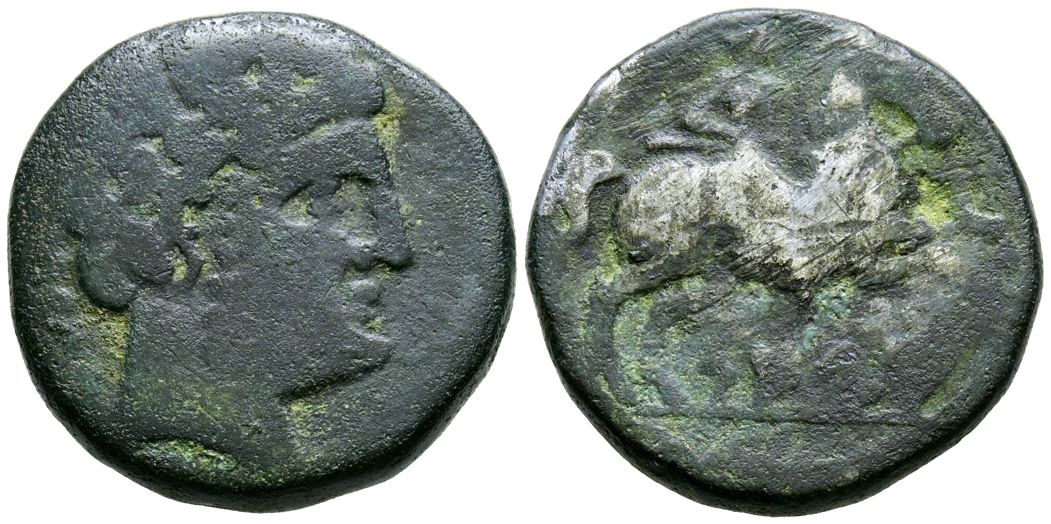 SEGIA, (Ejea de los Caballeros, Zaragoza). As. (Ae. 10.27g/23mm). 120-20 Fine (FAB-2157). Obv: Bearded male head with collar facing right, behind two dolphins. Rev: Lancer horseman facing right, above crescent and star, below on a line: SEGIA. VF-. Curious example with apparent traces of a silver plating on the reverse.
