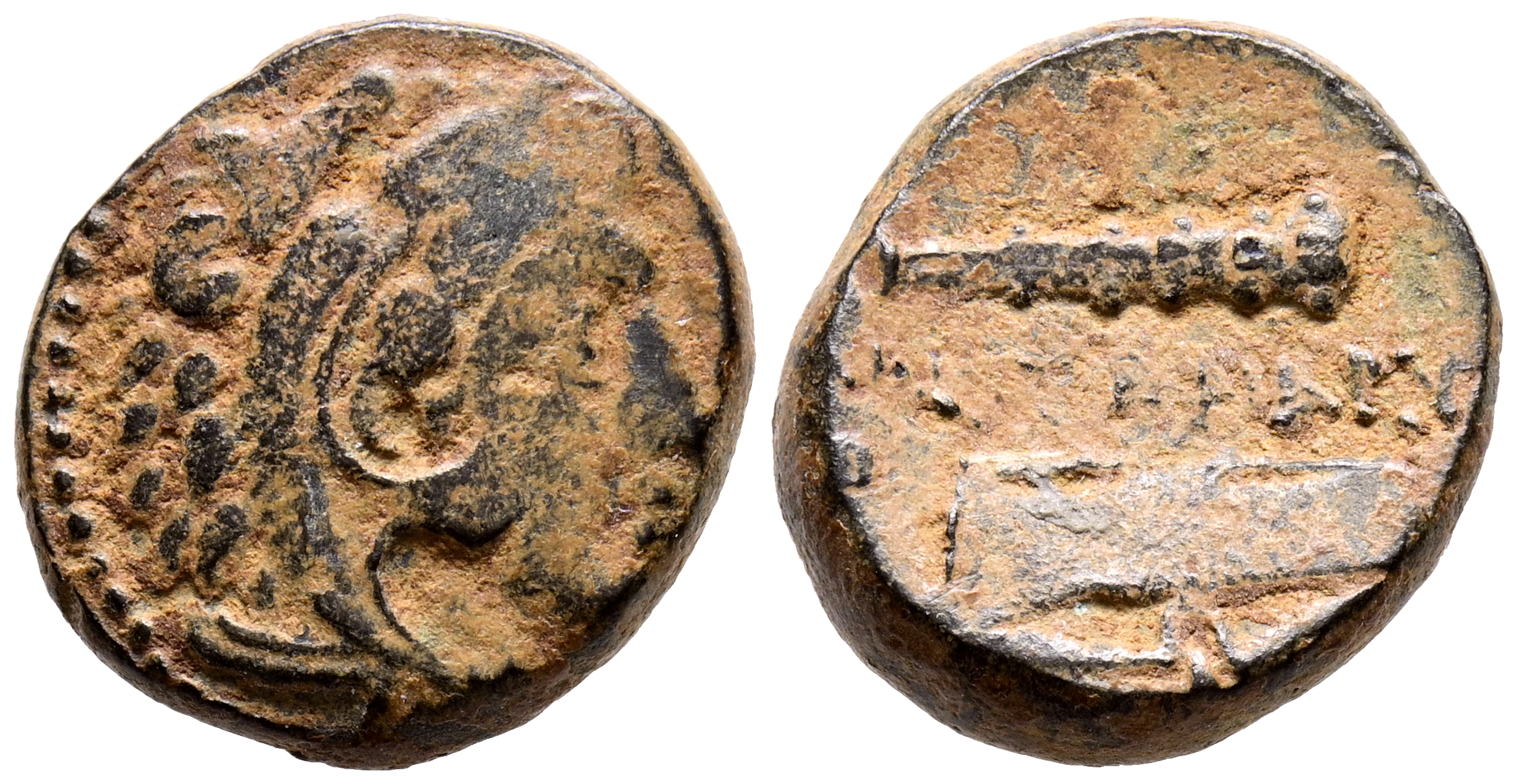 English KINGS OF MACEDONIA, Alexander III the Great. Ae17. (Ae. 5.34g/17mm). 336-323 Fine. Mint uncertain. (Price 266; HGC 3.1, 925a). Obv: Head of Hercules with lion skin facing right. Rev: Greek legend: ALETANDROY, between mace and bow with quiver. VF.