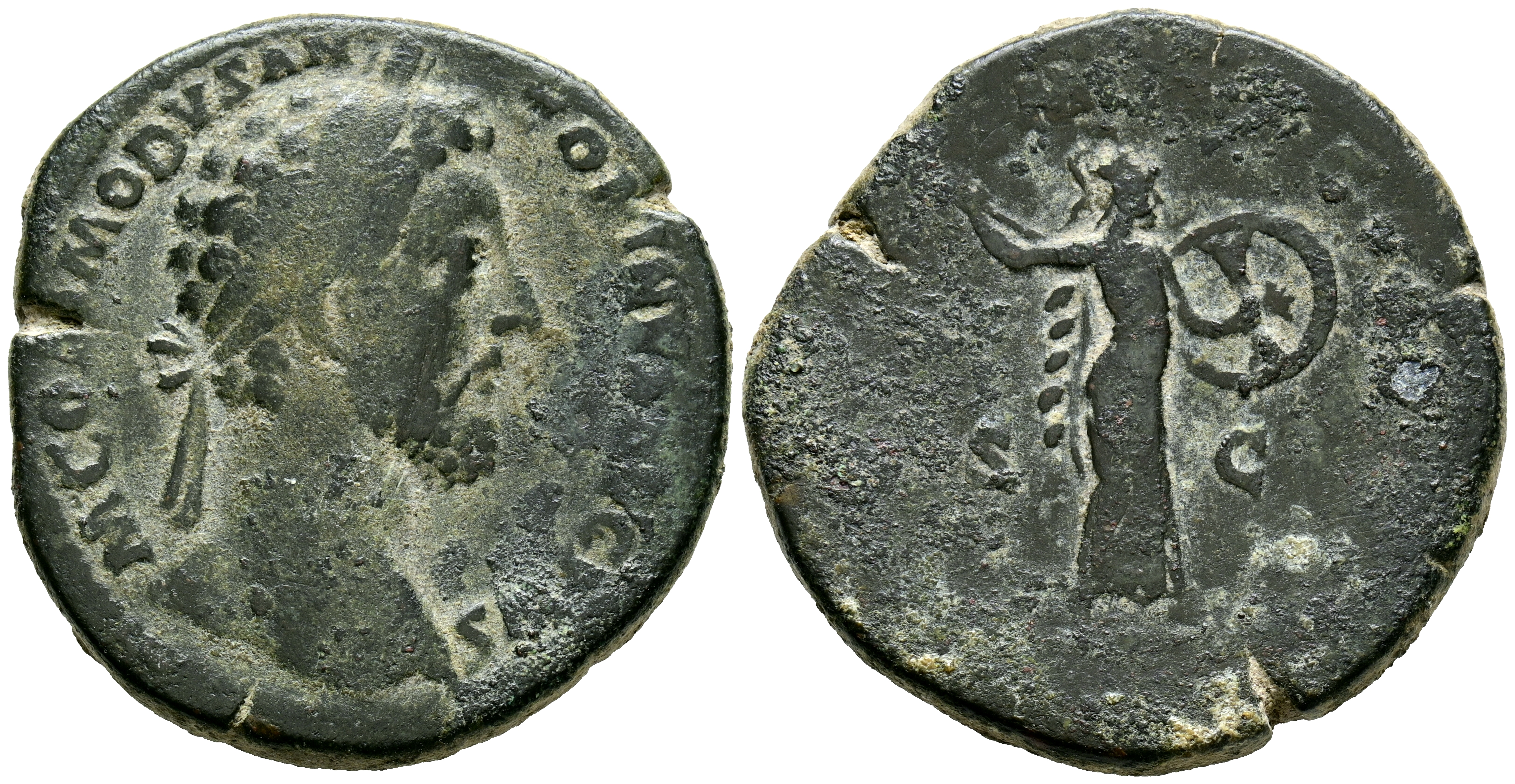 COMMODUS. Sestertius. (Ae. 21.07g/27mm). 183-184 AD Rome. (RIC 410). Obv: Laureate head of Commodus facing right, around legend: M COMMODVS ANTONINVS AVG PIVS. Rev: Minerva advancing right carrying spear and shield, between: Uncirculated, around legend: TR P VIII IMP VI COS IIII P P. Fine.
