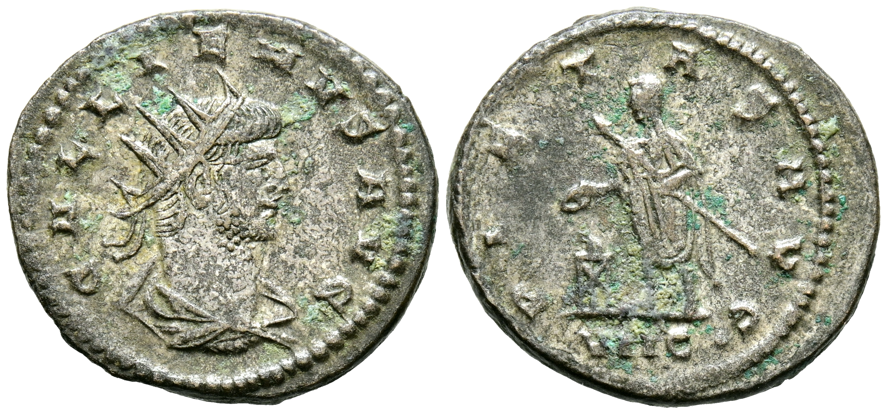 GALLIENUS. Antoninianus. (Ae. 4.07g/21mm). 266-267 AD Antioch. (RIC 618). Obv: Radiate bust of Gallienus in cuirass facing right, around legend: GALLIENVS AVG. Rev: Gallienus standing right holding scepter and paten on altar, in exergue: VIIC, around legend PIETAS AVG. Good Very Fine.