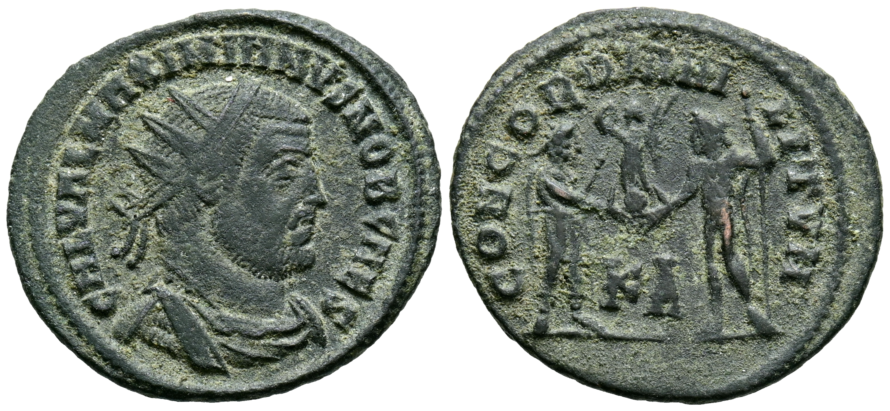 GALERIUS. Antoninianus. (Ae. 2.60g/22mm). 295-299 AD Cyzicus. (RIC 18b). Obv: Draped radiate bust of Galerius facing right, around the legend: GAL VAL MAXIMINVS NOB CAES. Rev: Galerius standing right holding a scepter and receiving Victory with a laurel wreath from Jupiter standing left holding a spear, between them: KA, around the legend: CONCORDIA MILITVM. VF+.