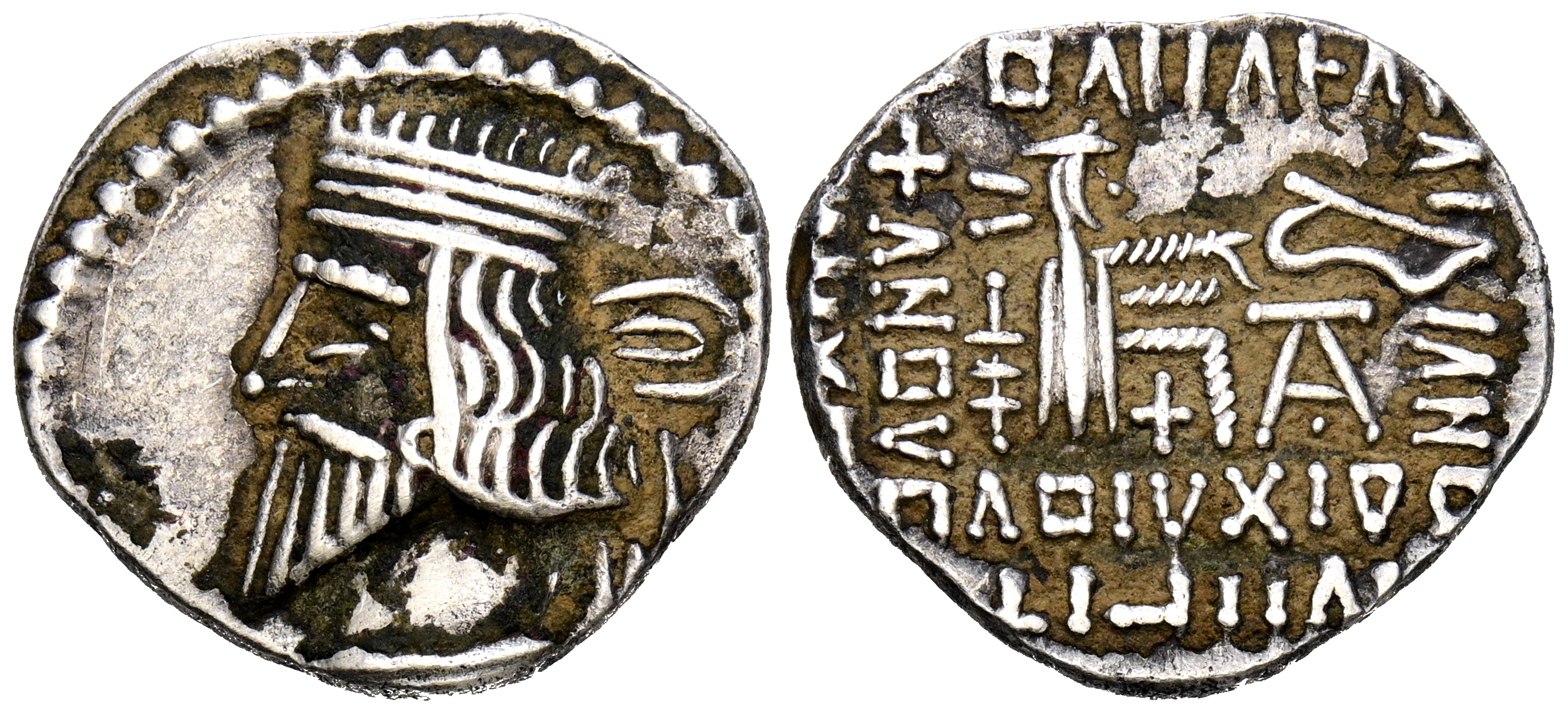 PAKOROS I. Drachma. (Ar. 3.73g/17mm). 78-120 Fine Ekbatana. (Sellwood 78.3). Obv: Diademed bust of Pakoros I with tiara and drapery facing left. Rev: Seated archer facing right holding a bow, legend around. VF.
