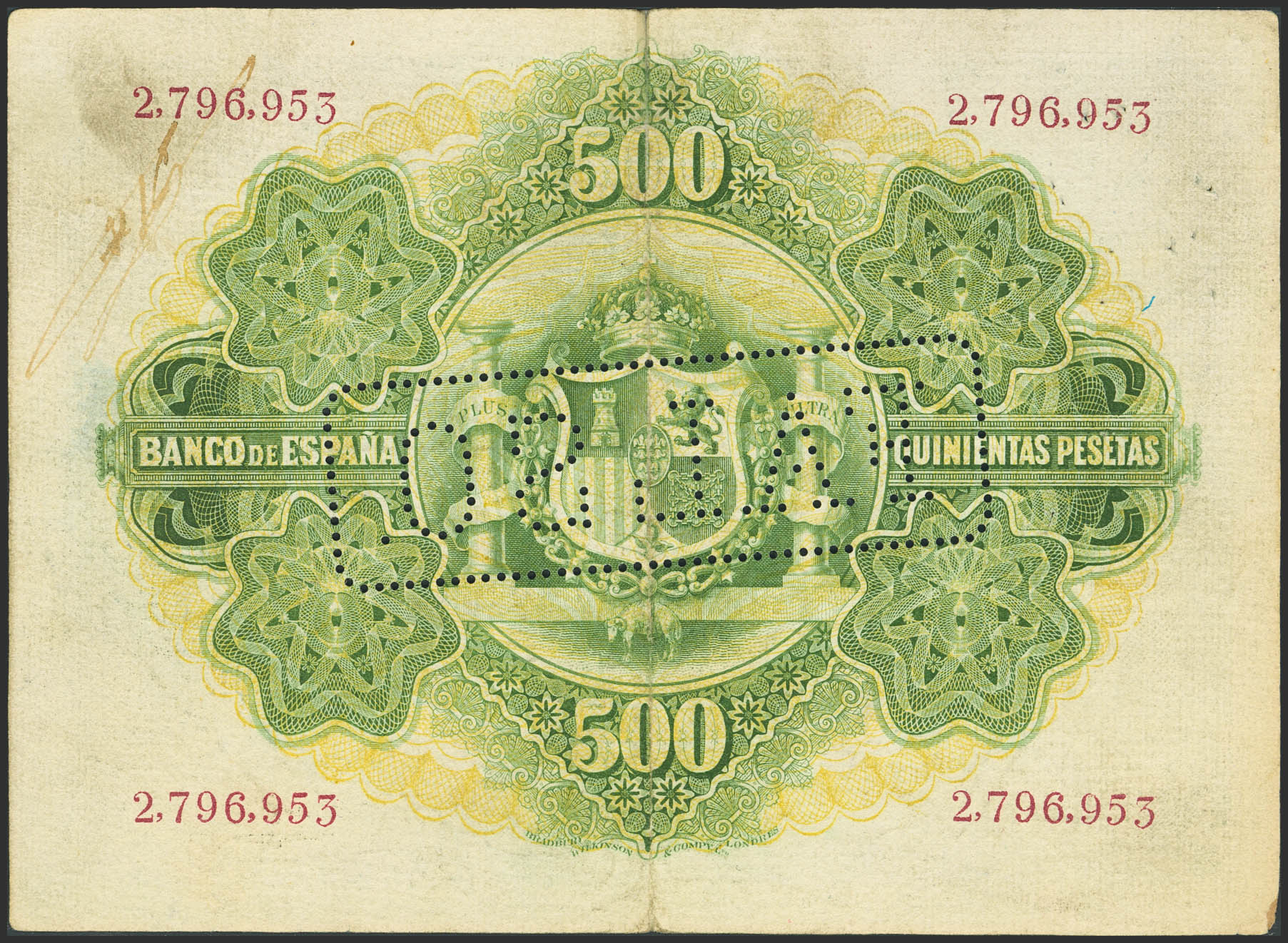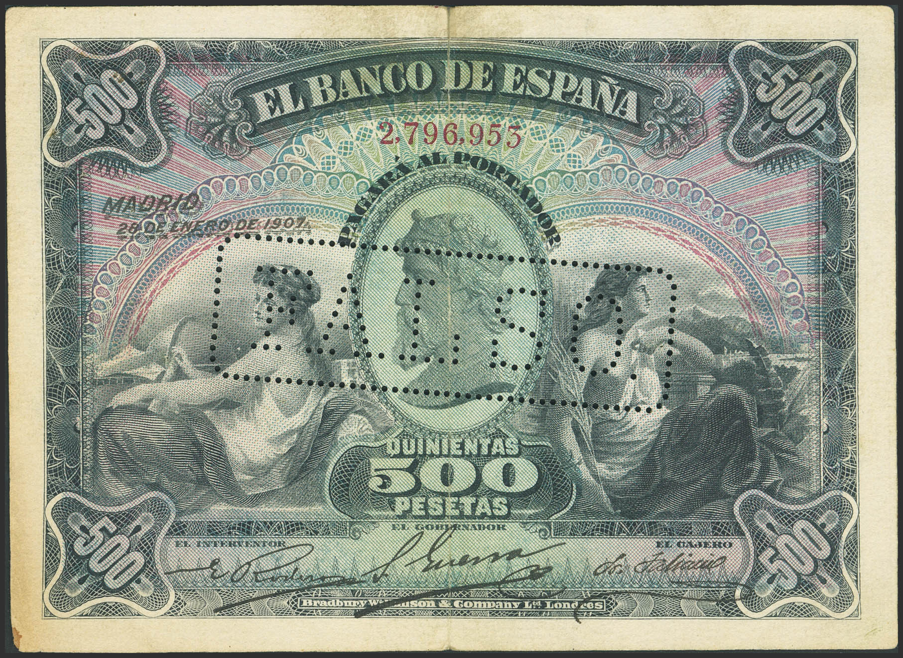 500 Pesetas. January 28, 1907. Contemporary counterfeit. No serial number and perforated. (Edifil 2023: 316F, Cobo: 34). Rare. VF+.