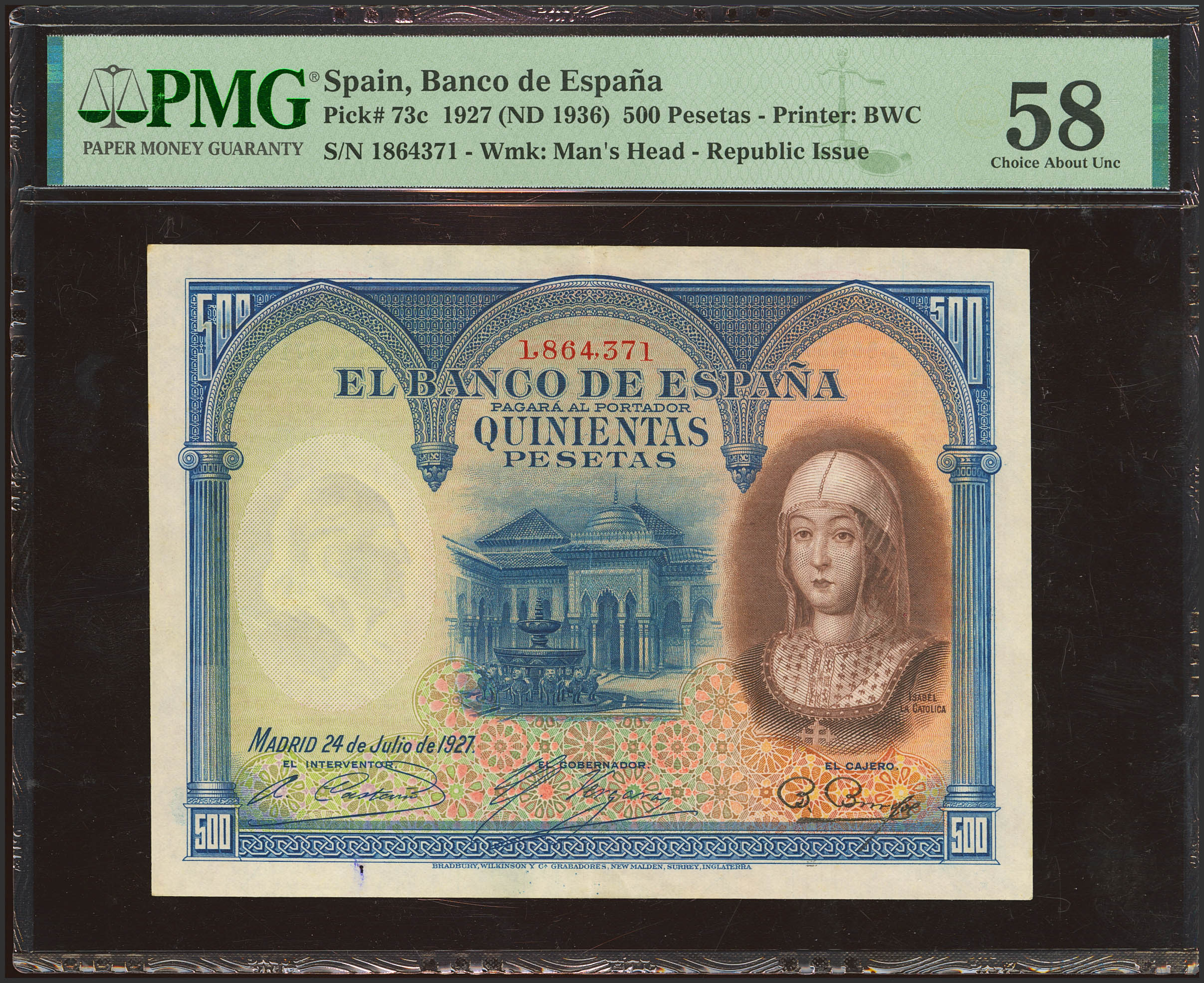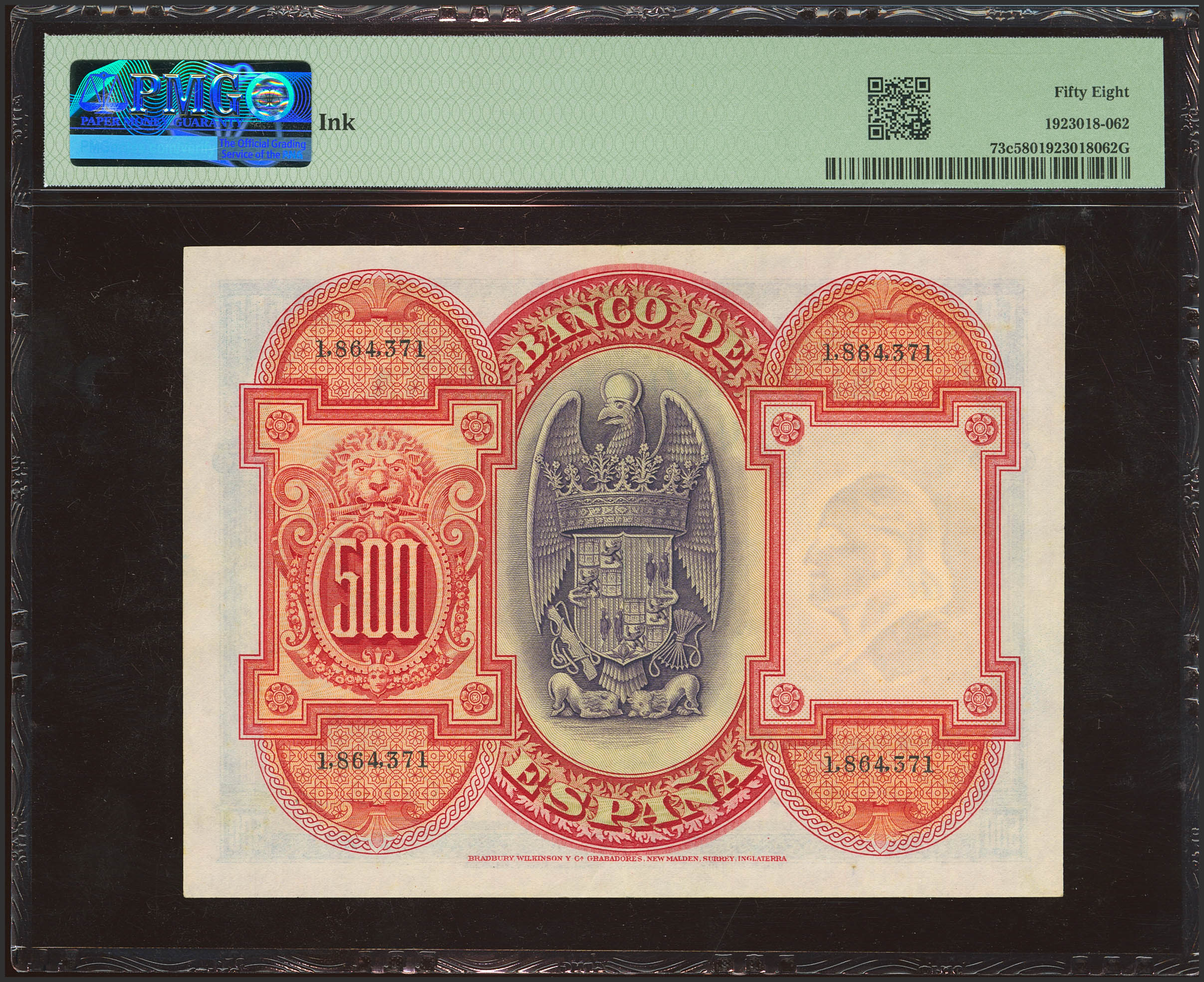 500 Pesetas. July 24, 1927. No series or serial number after 1602000. (Edifil 2023: 352, Pick: 73c). Good Extremely Fine+. PMG58 (ink) package.