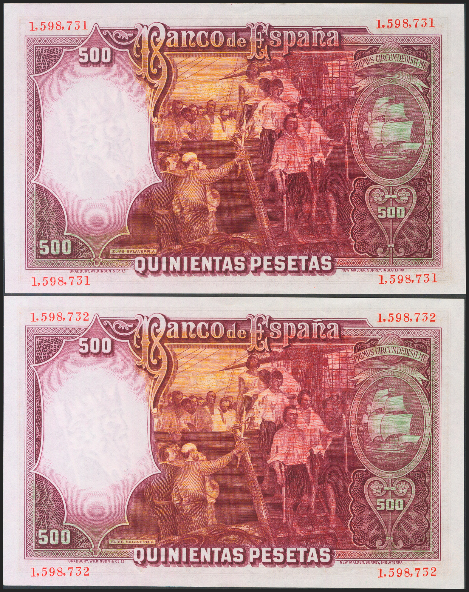 500 Pesetas. April 25, 1931. Consecutive pair. No series. (Edifil 2021: 361). Original finish. Uncirculated-.