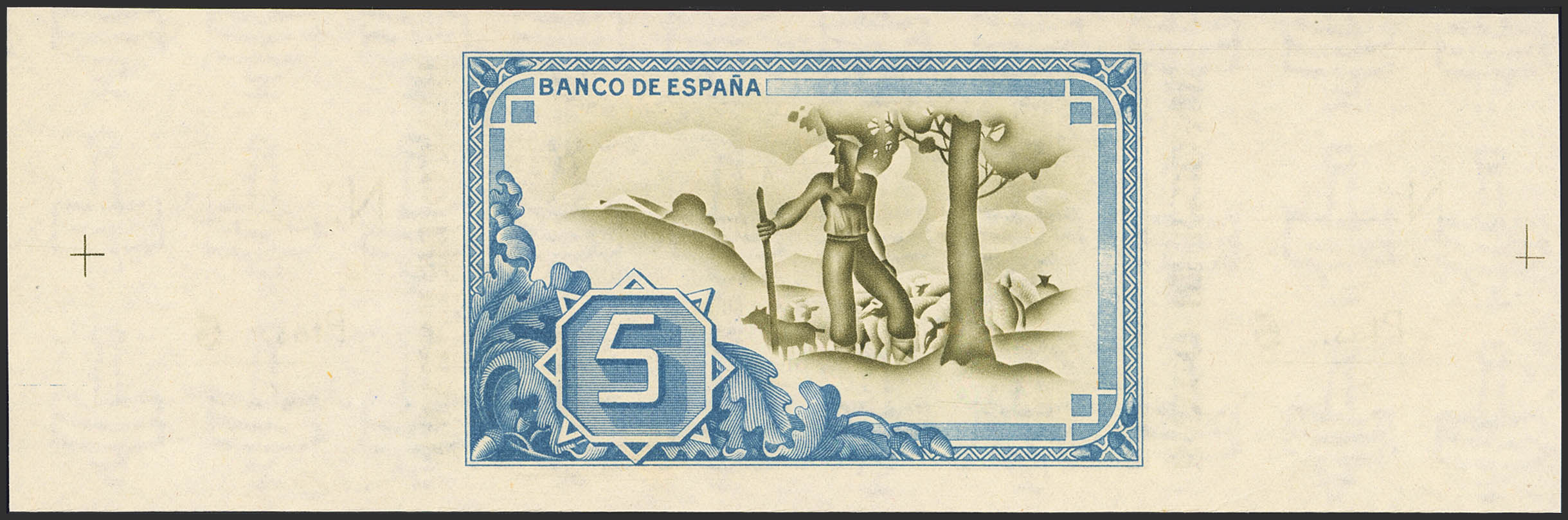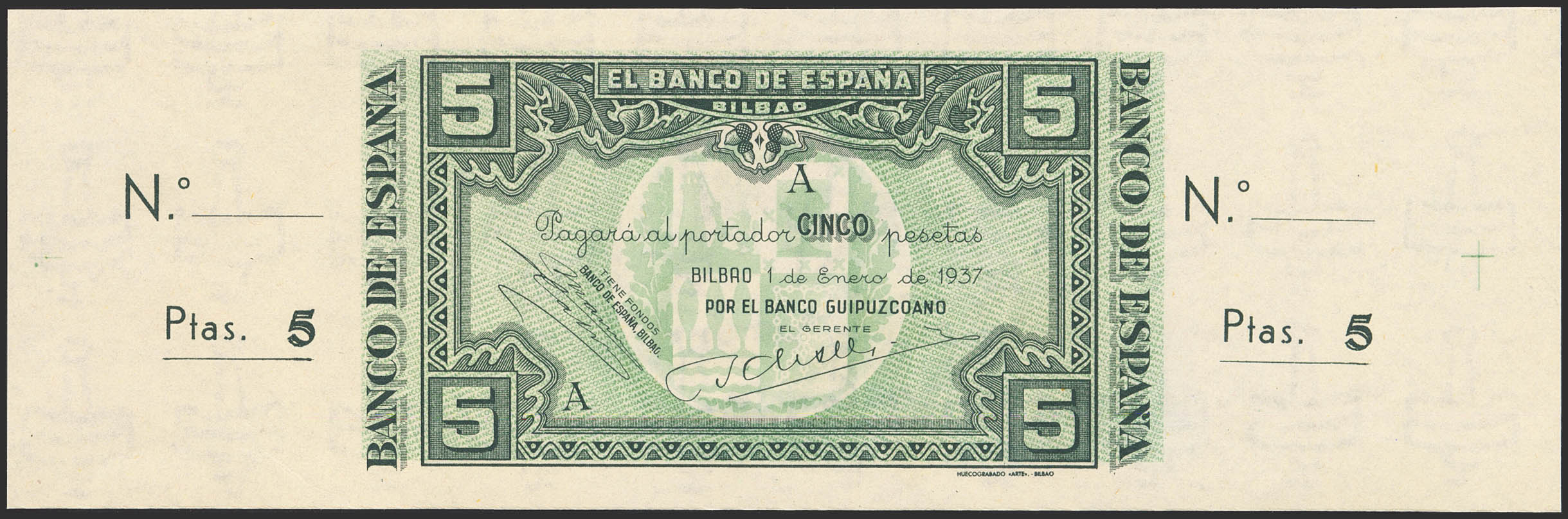 5 Pesetas. January 1, 1937. Bilbao branch, signed Banco Guipuzcoano. Series A and unnumbered, with both matrices. (Edifil 2023: 386c). Original finish. Uncirculated.