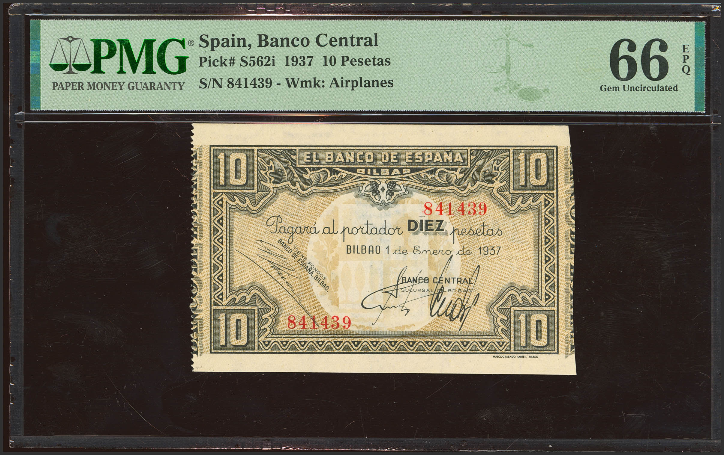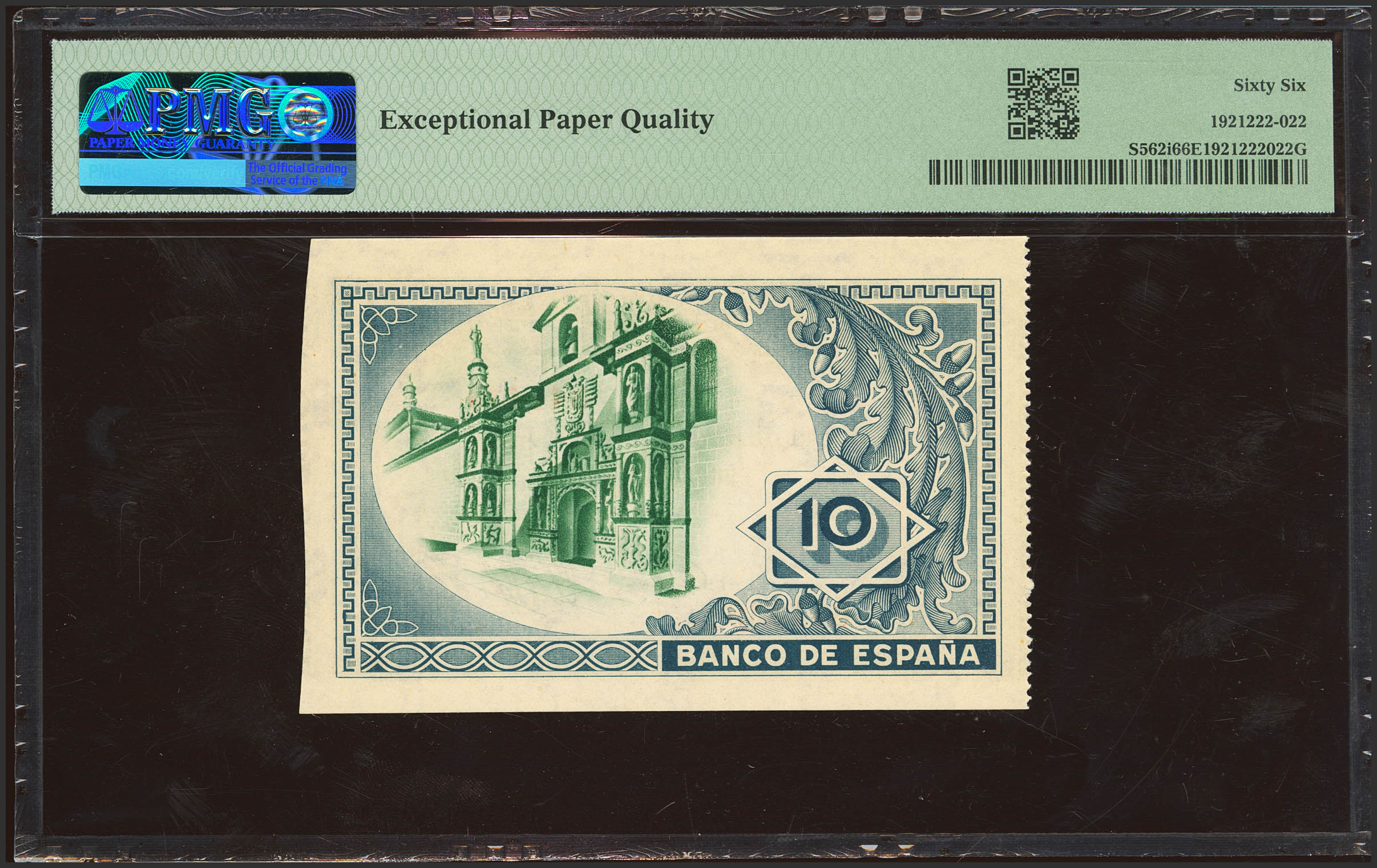 English 10 Pesetas. January 1, 1937. Bilbao branch, Central Bank signature. No serial number or dies. (Edifil 2023: 387c, Pick: S562i). Original finish. Uncirculated. PMG66EPQ encapsulated.