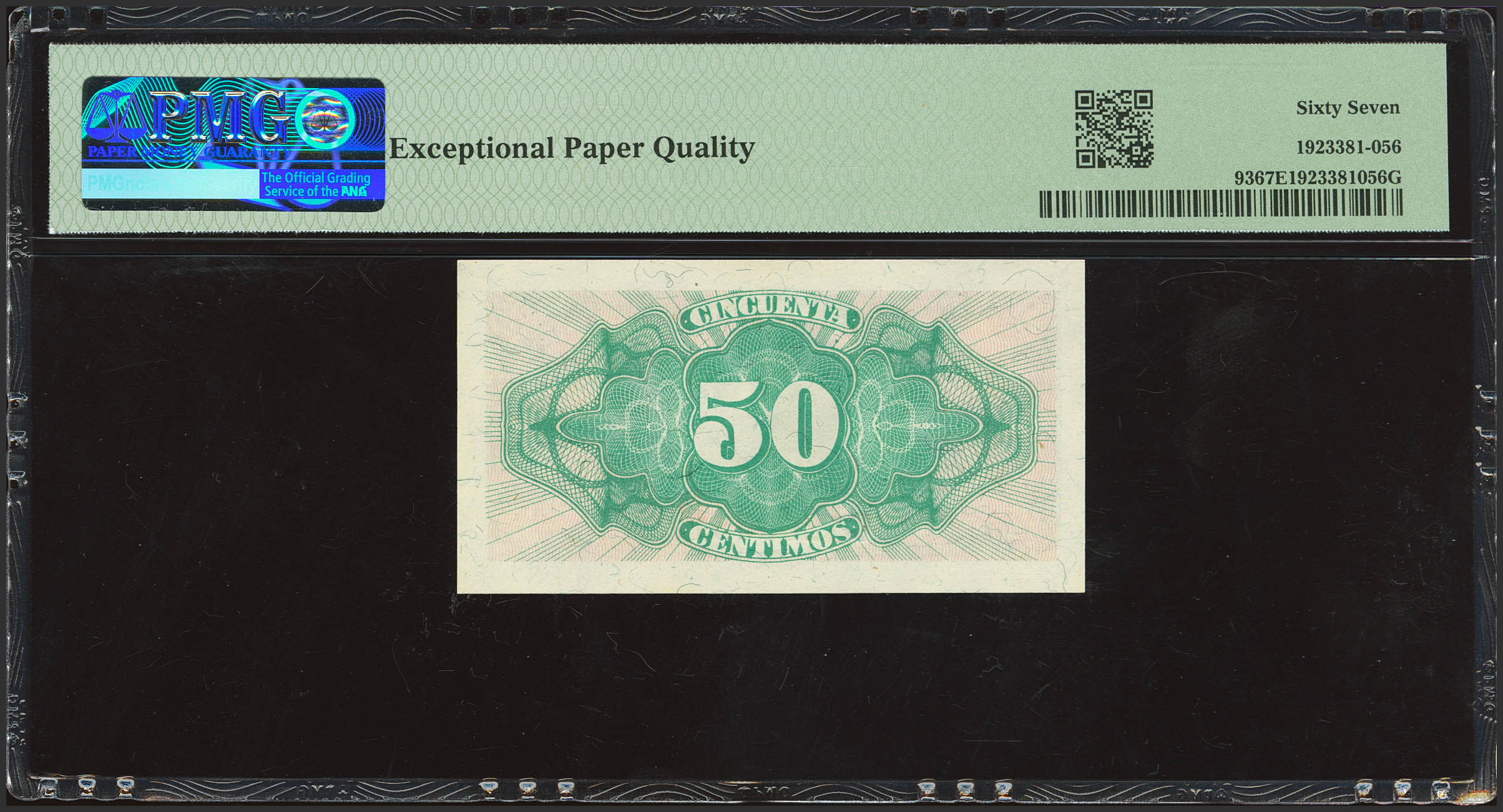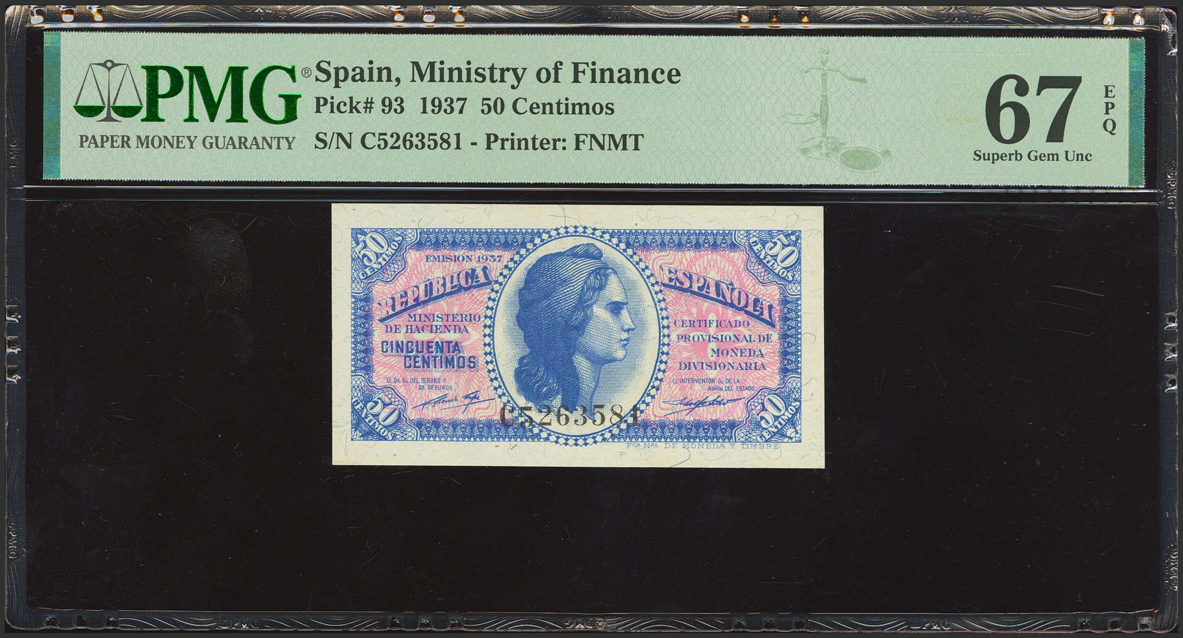English 50 Centimos. 1937. Series C. (Edifil 2023: 391a, Pick: 93). Original finish. Uncirculated. PMG67EPQ encapsulated.