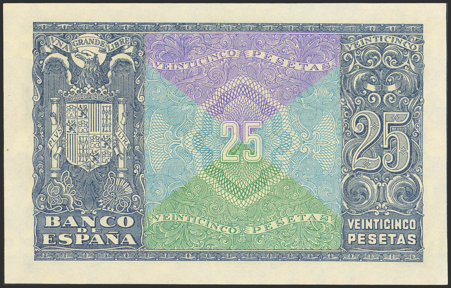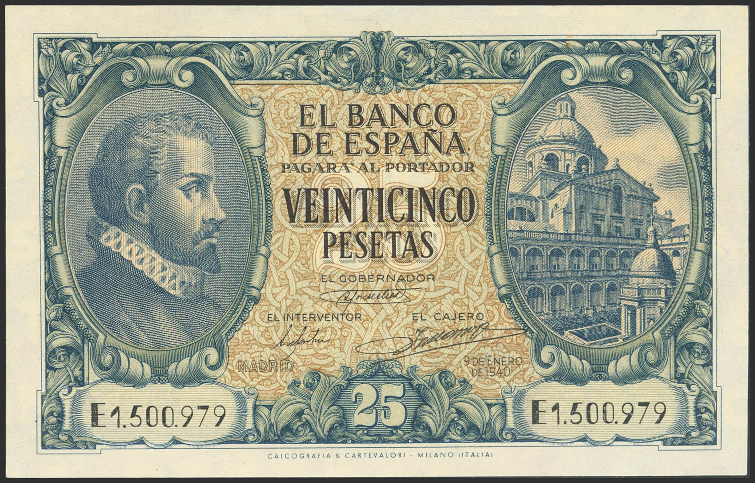 25 Pesetas. January 9, 1940. Series E. (Edifil 2023: 436a). Original condition. Extremely Fine.