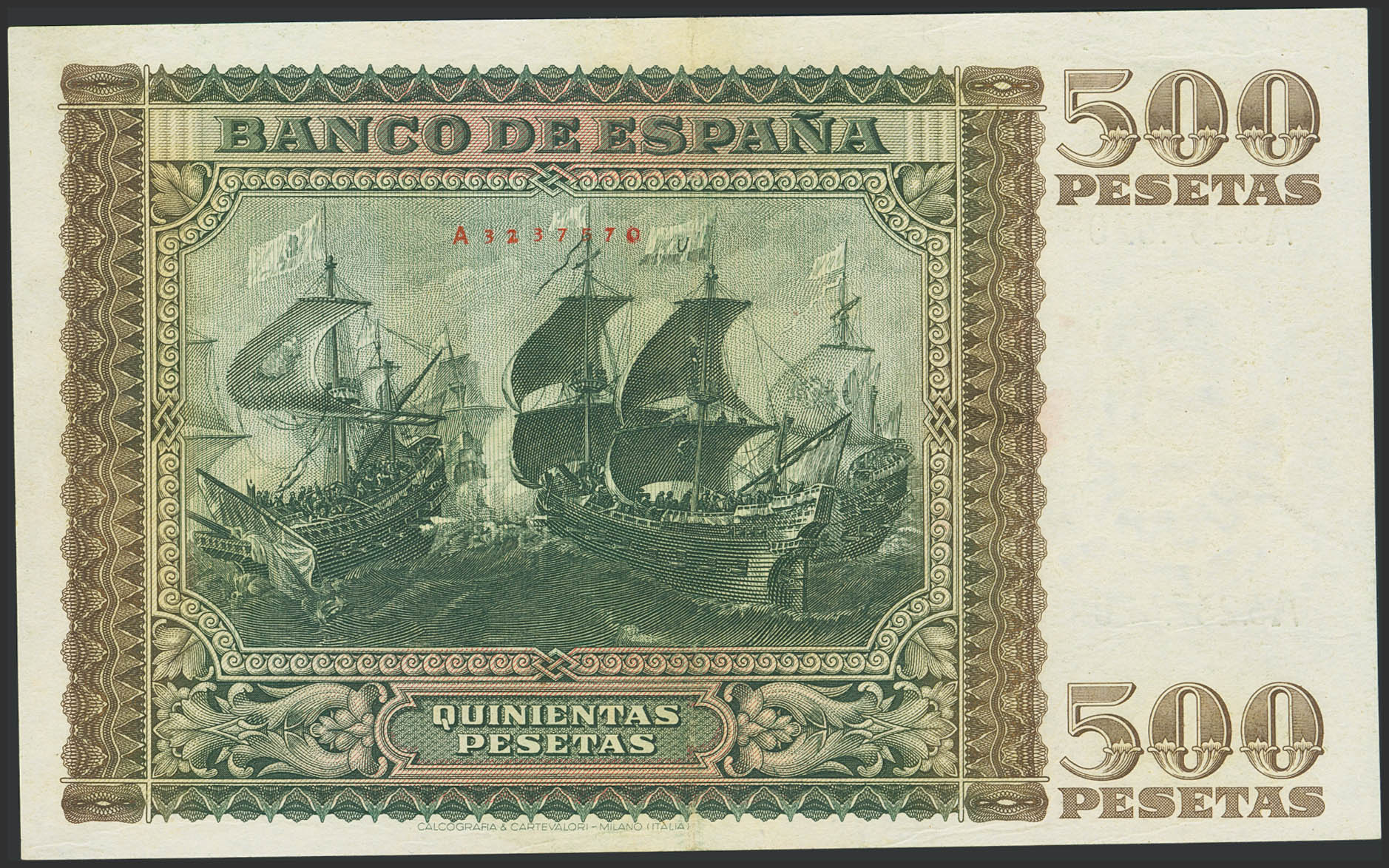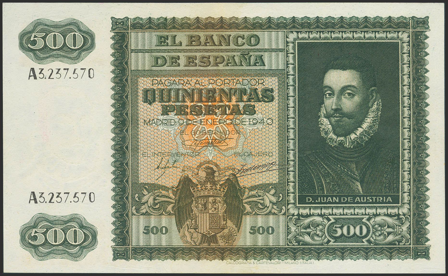 500 Pesetas. January 9, 1940. Series A. (Edifil 2023: 439). Retains some of its original finish. Extremely Fine.