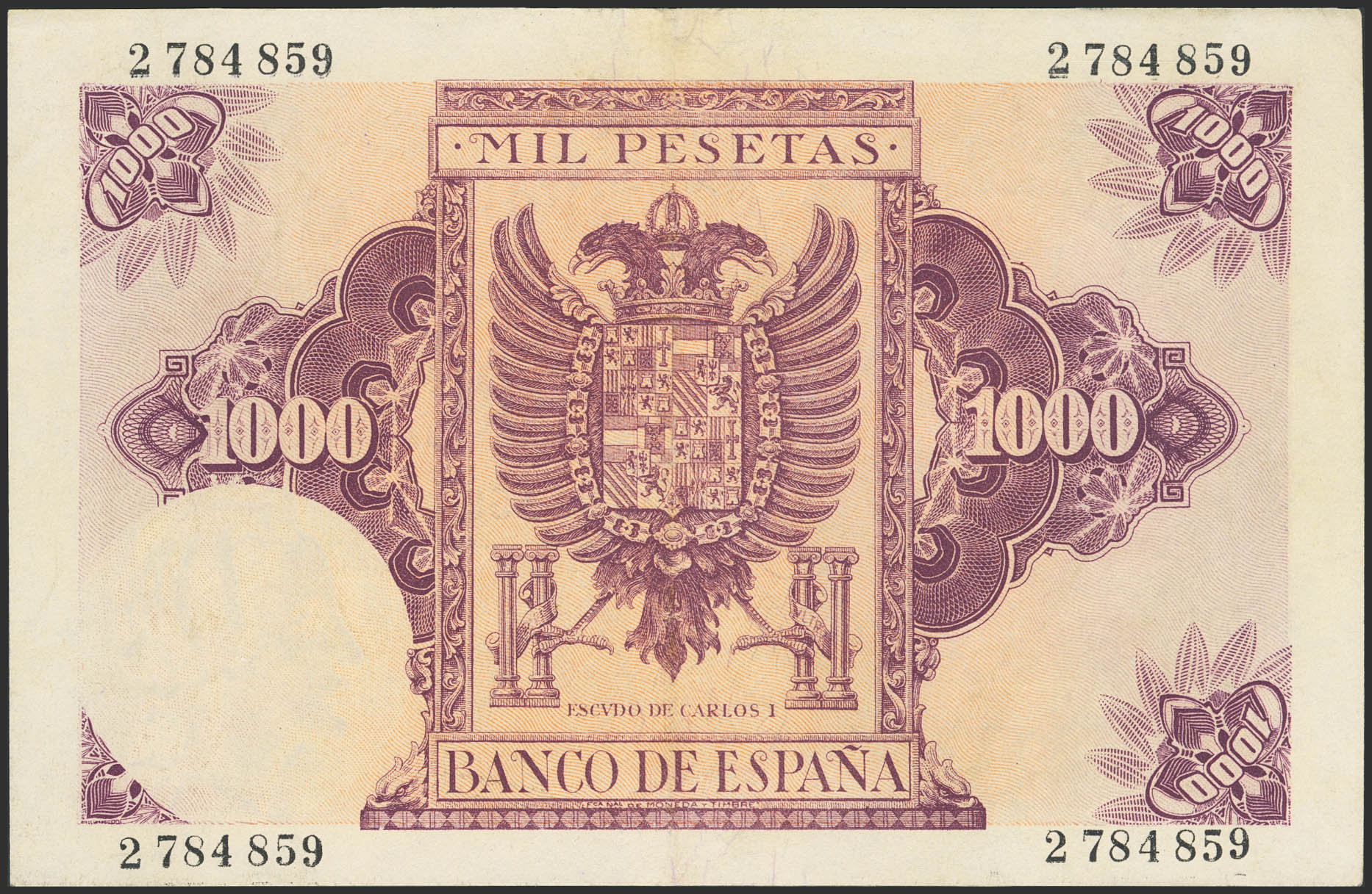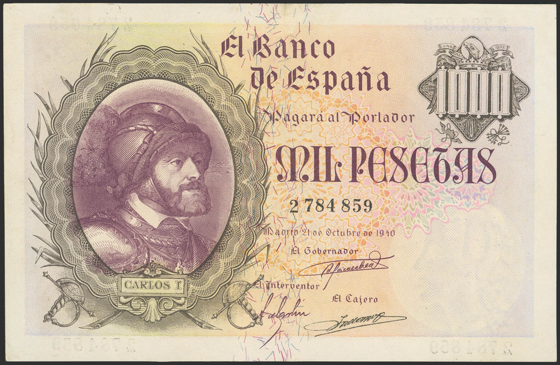 1000 Pesetas. October 21, 1940. No series. (Edifil 2023: 445). Retains some of the original finish. Extremely Fine.