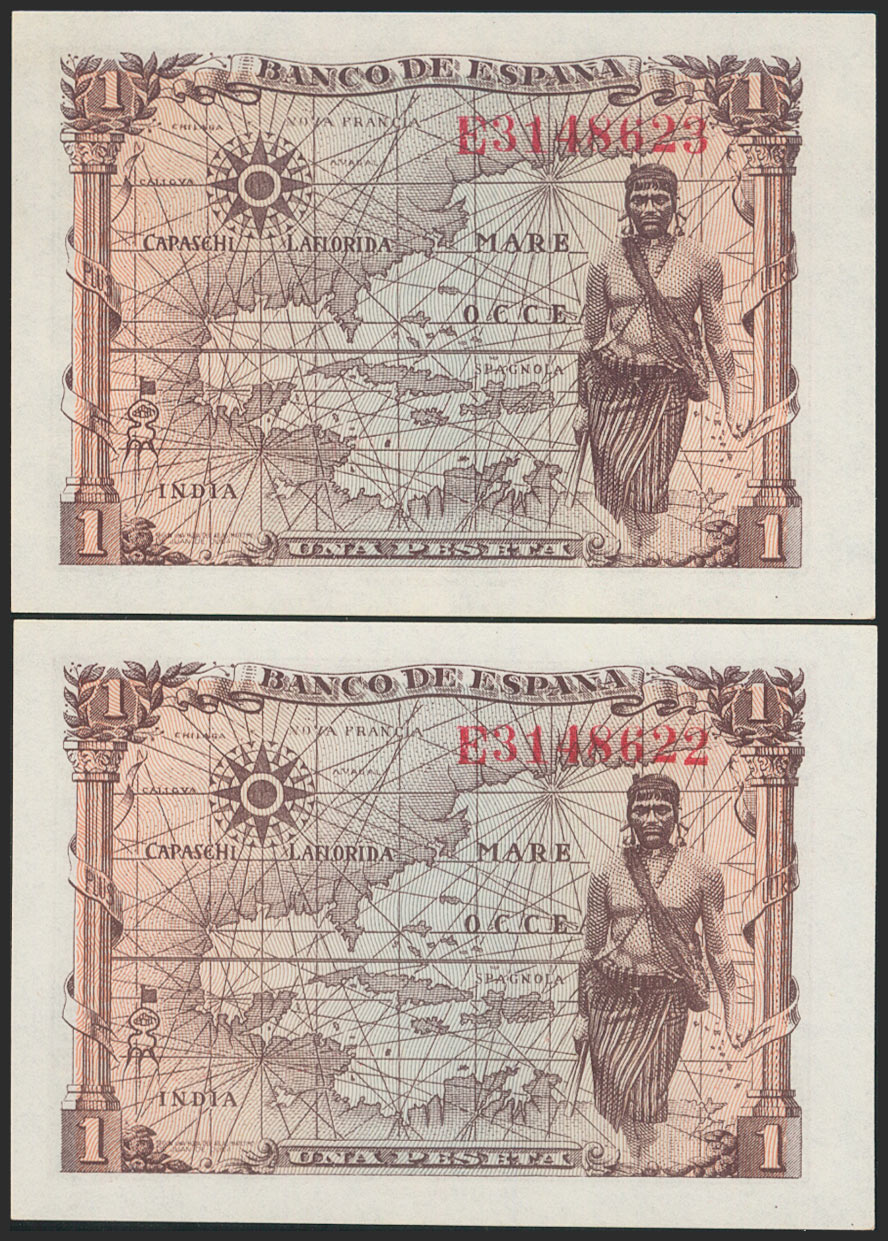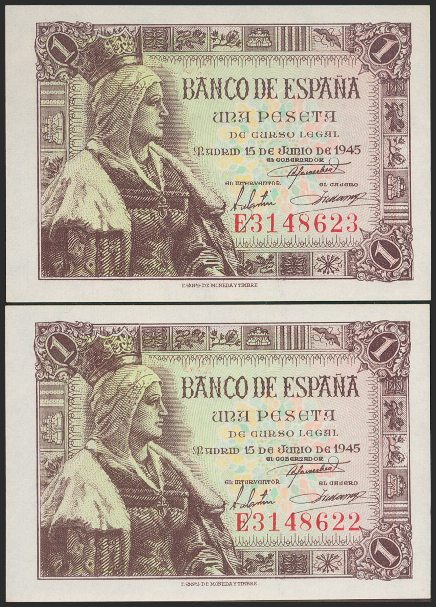 1 Peseta. June 15, 1945. Consecutive pair. Series E. (Edifil 2021: 448a). Original finish. Uncirculated.