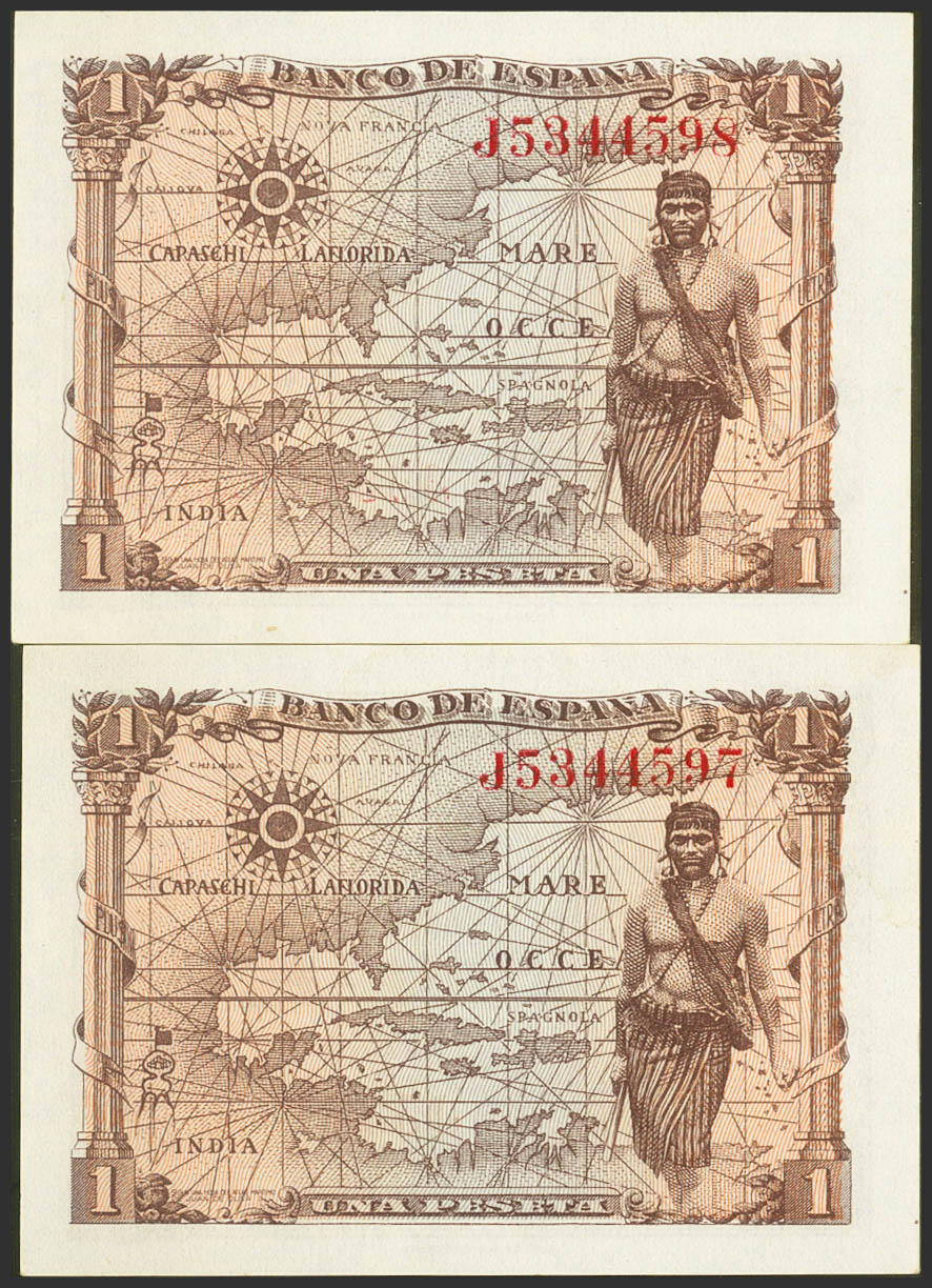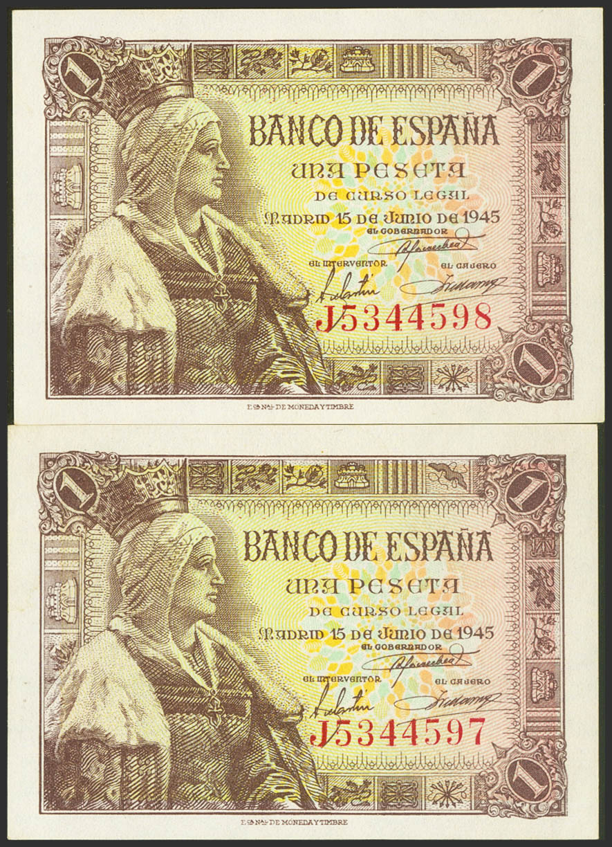 English 1 Peseta. June 15, 1945. Consecutive pair. Series J. (Edifil 2021: 448a). Original finish. Uncirculated.