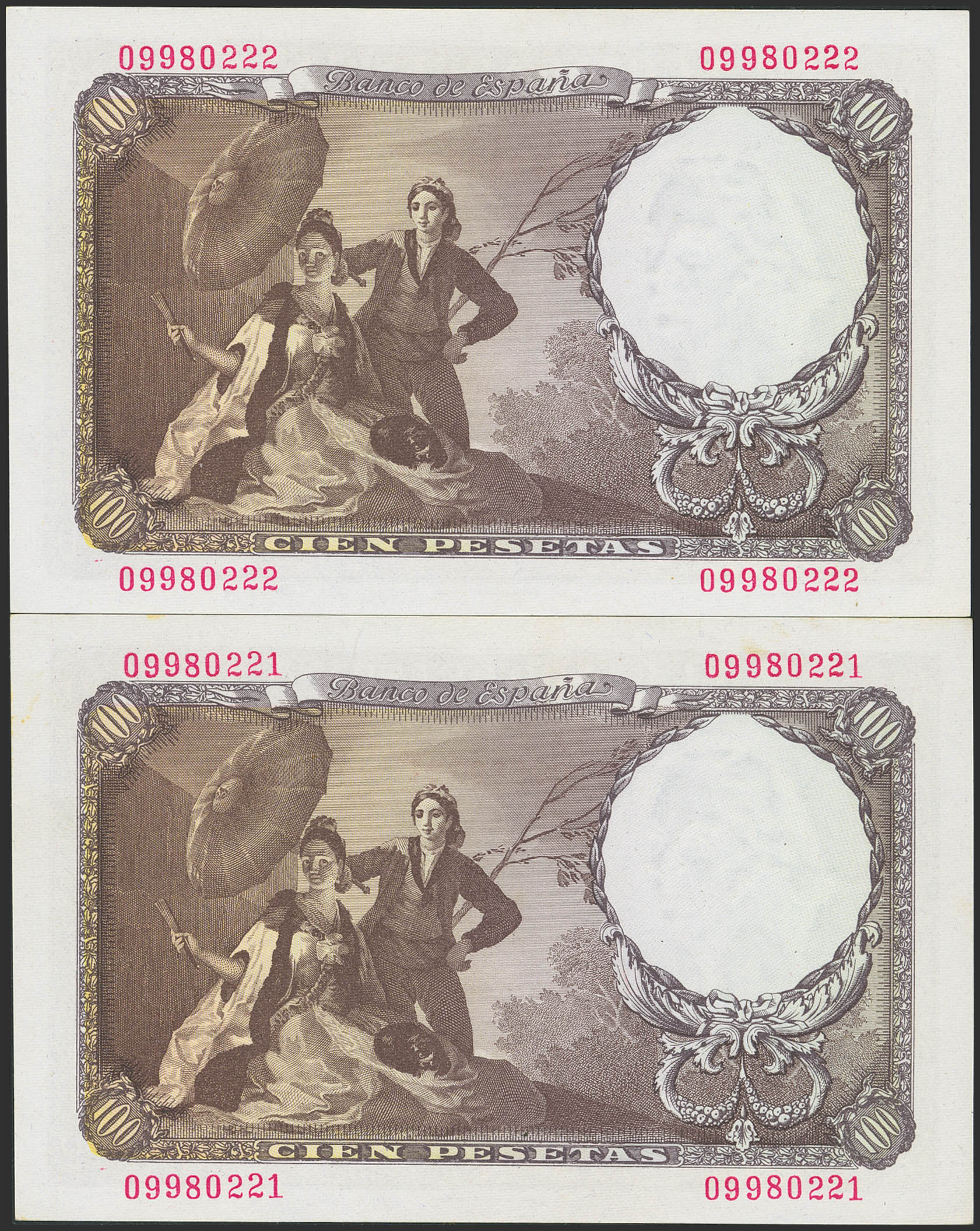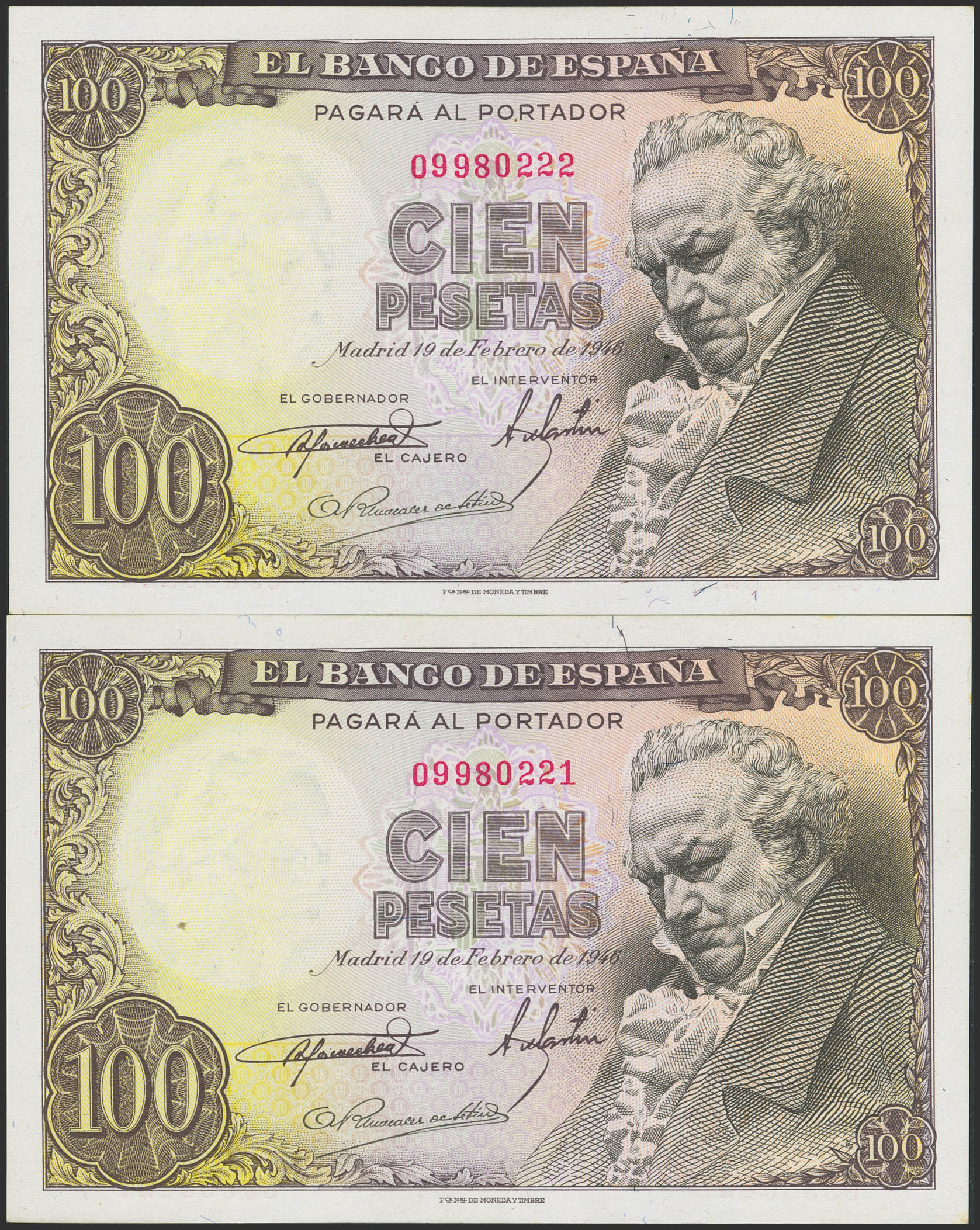 100 Pesetas. February 19, 1946. Consecutive pair. No series. (Edifil 2023: 451). Very rare in this condition, original finish. Uncirculated.