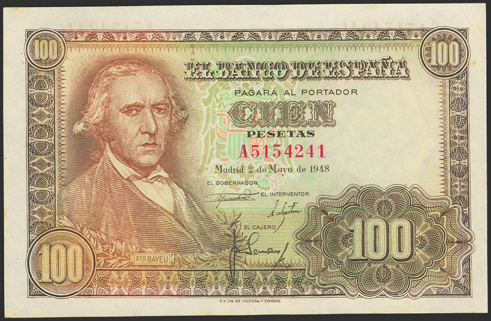 100 Pesetas. May 2, 1948. Series A. (Edifil 2023: 456a). Original finish. Uncirculated-.