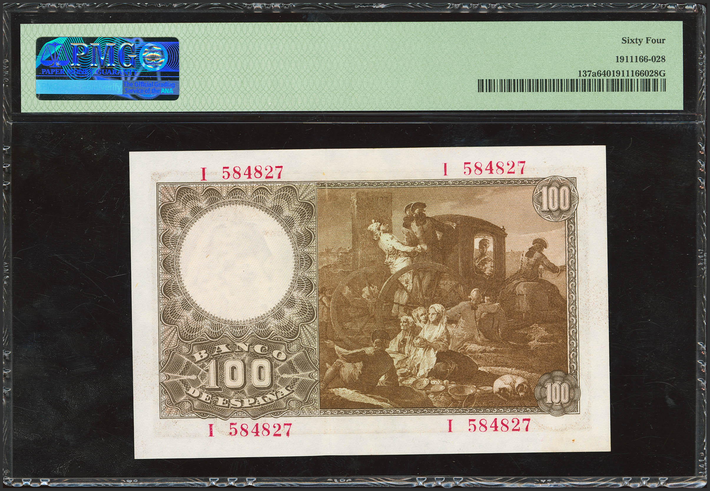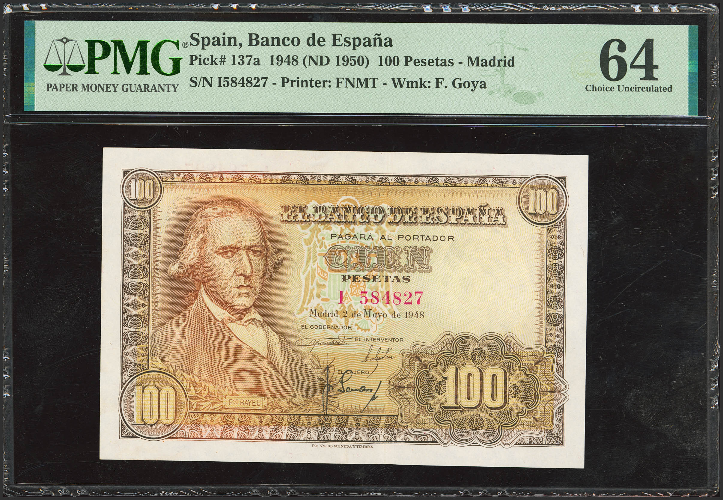 100 Pesetas. May 2, 1948. Series I, last series issued. (Edifil 2023: 456b, Pick: 137a). Uncirculated. PMG64 encapsulated.