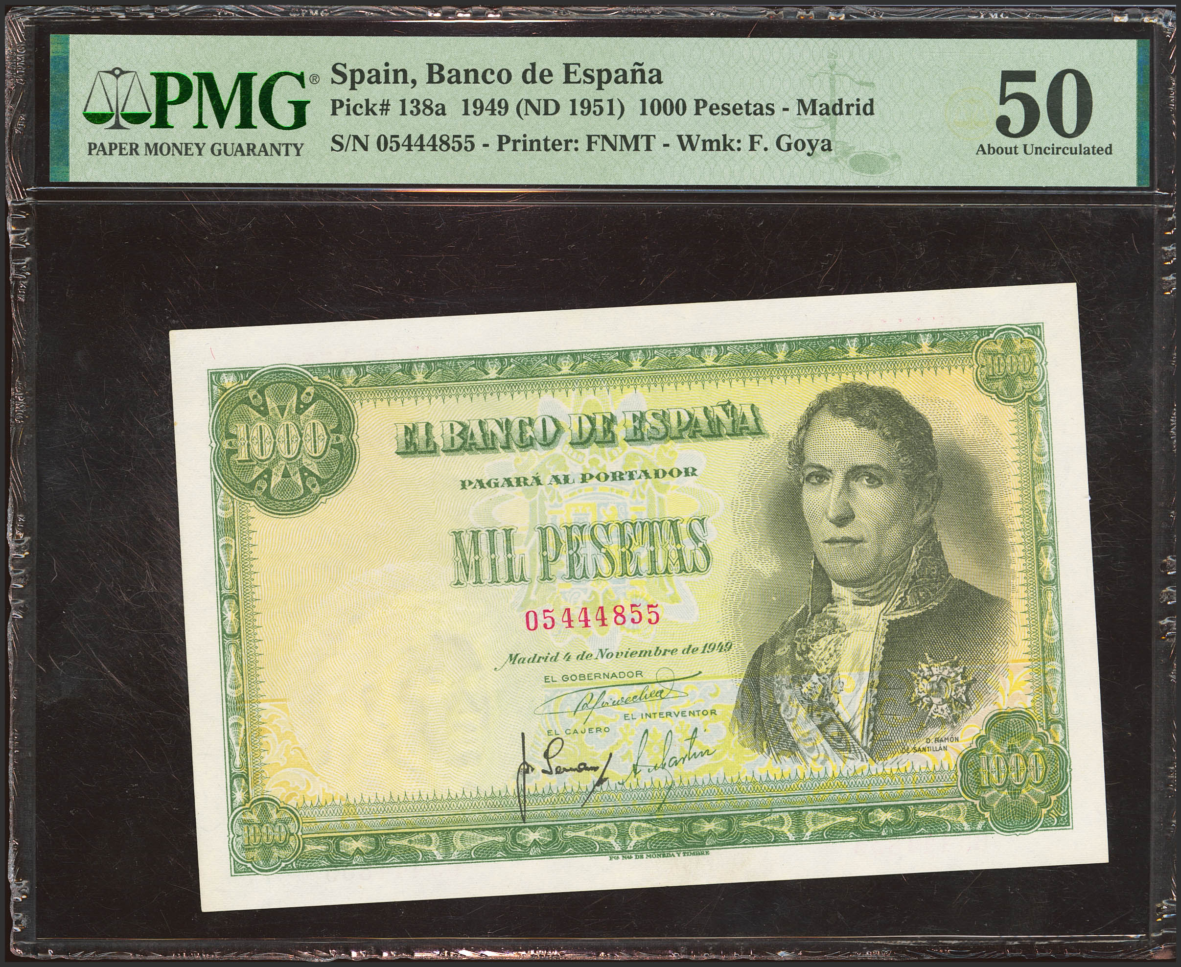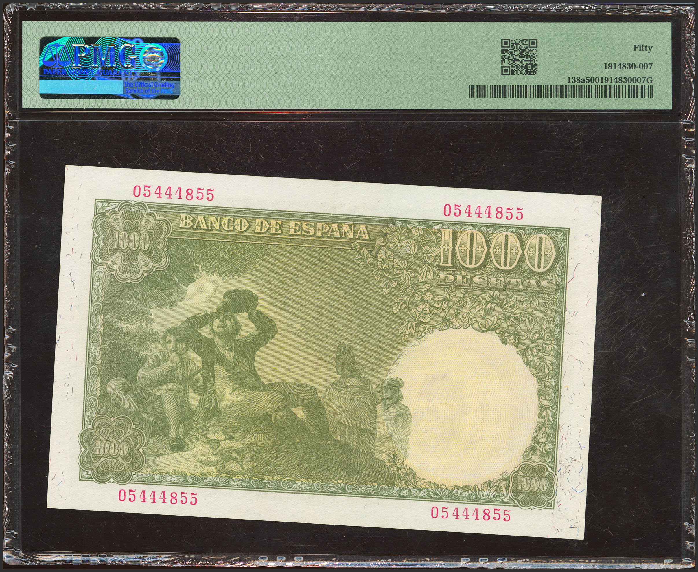 1000 Pesetas. November 4, 1949. No serial number. (Edifil 2023: 458, Pick: 138a). EF. PMG50 package.