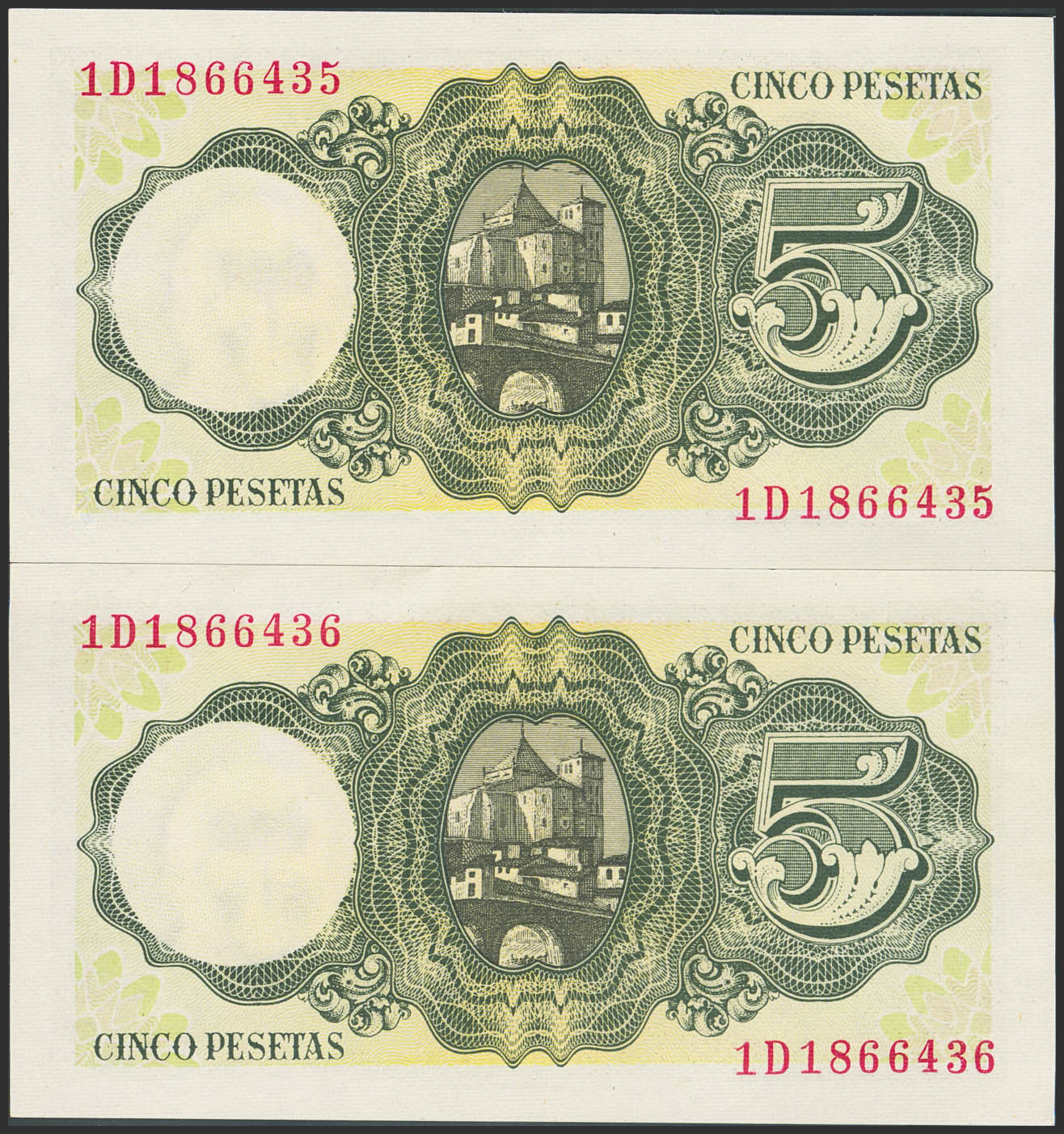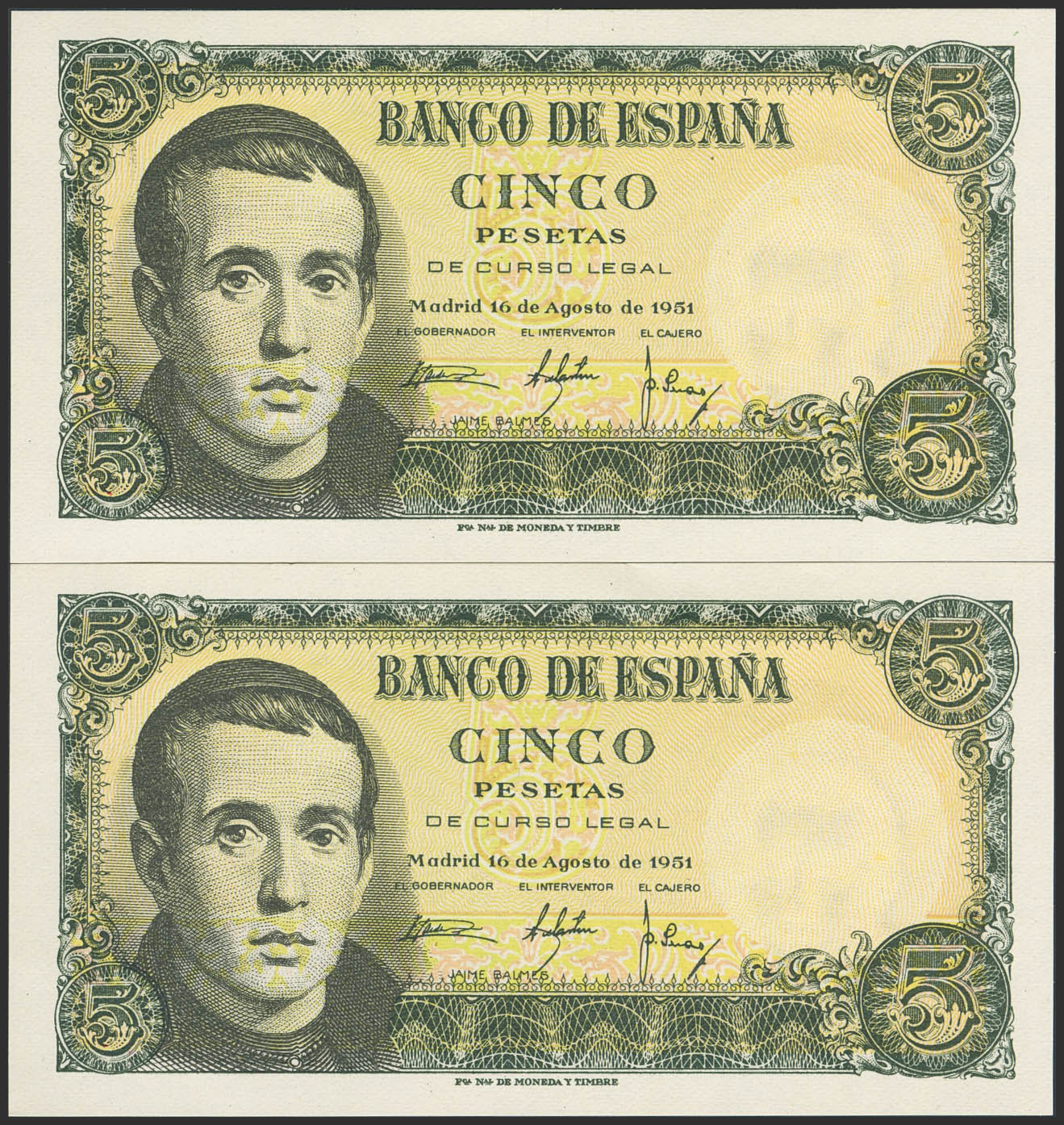 English 5 Pesetas. August 16, 1951. Consecutive pair. Series 1D. (Edifil 2023: 459a). Original finish. Uncirculated/Uncirculated-.